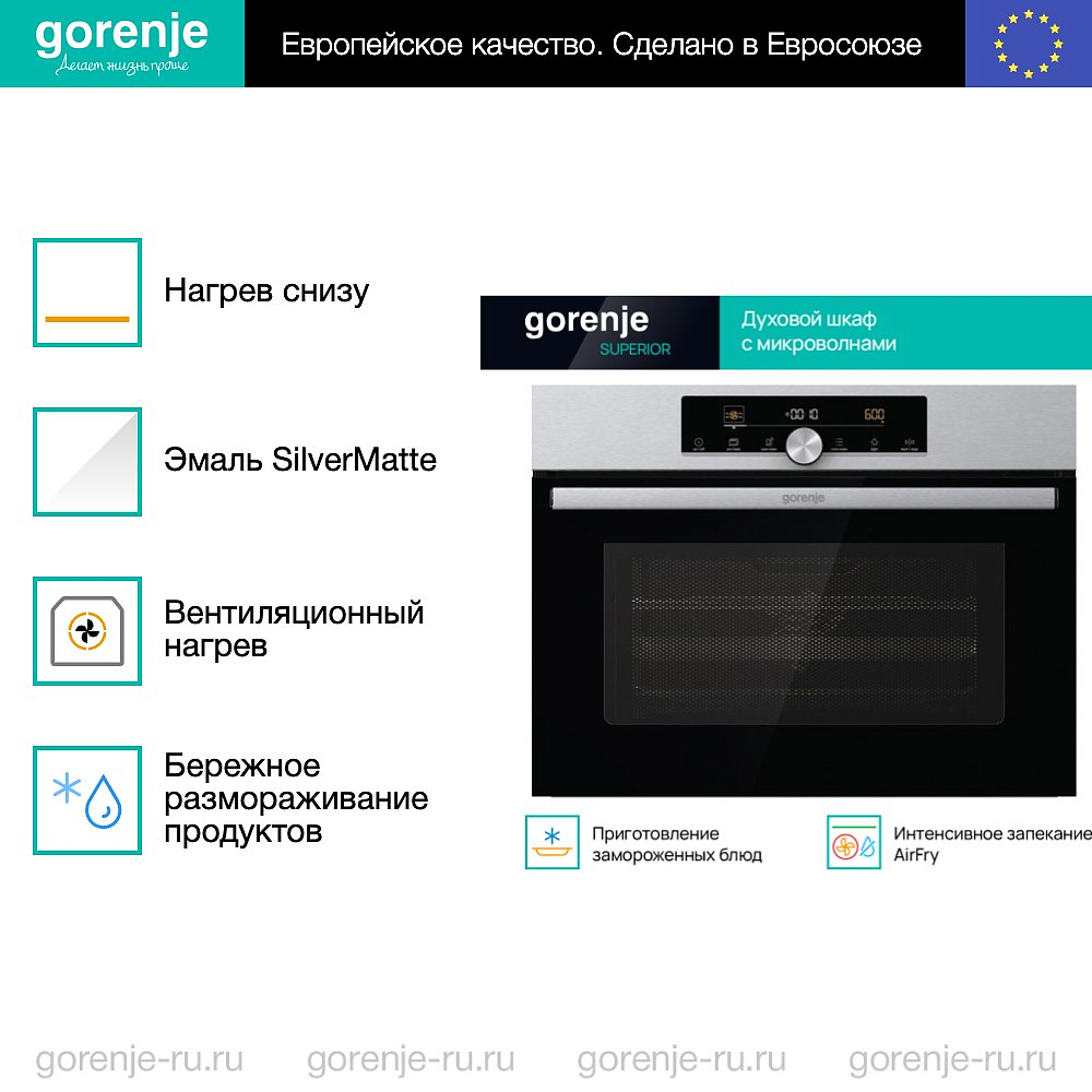 Духовой шкаф Горенье BCM4547A10X оснащён конвектором и функцией микроволн. В совокупности с разными видами нагрева, конвекции, гриля и микроволн предусмотрены 17 режимов на которых можно приготовить любые блюда. Можно воспользоваться интенсивным запеканием, приготовлением выпечки из замороженных полуфабрикатов, режимом пицца, уникальным медленным приготовлением, разогревом готовых блюд и посуды, размораживанием и многими другими заложенными функциями. Равномерность пропекания создаёт система MultiFlow 360.
