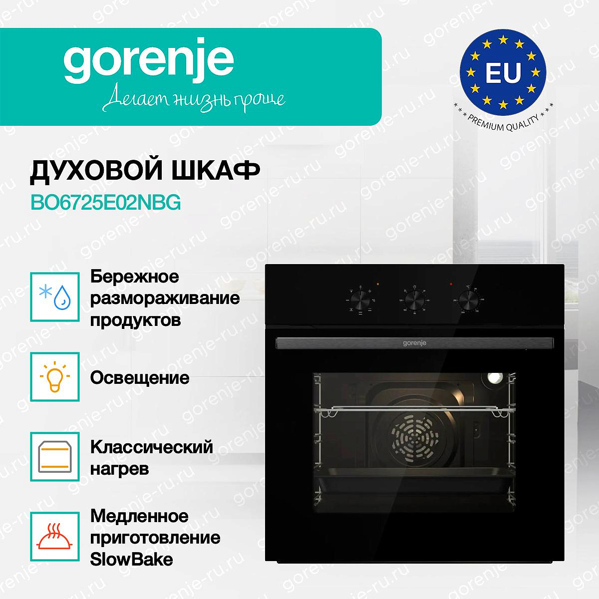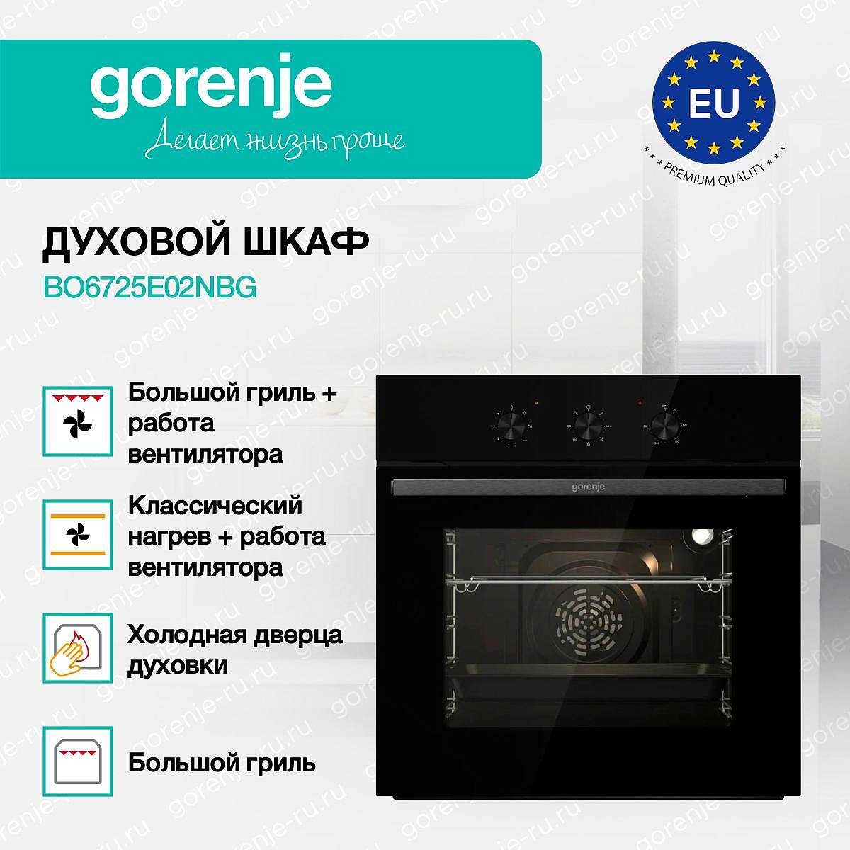 ** Все информационные материалы, представленные на Сайте, носят справочный характер и не могут в полной мере передавать достоверную информацию о свойствах, комплектации и характеристиках товара, включая цвета, размеры и формы. Фирма-производитель оставляет за собой право на внесение изменений в конструкцию, дизайн и комплектацию товара без предварительного уведомления. Перед оформлением Заказа Покупатель должен обратиться к Продавцу для уточнения свойств и характеристик Товара. Подробная информация о товаре указывается в инструкции и на упаковке товара. Используемое название в России: Горенье BO6725E02NBG