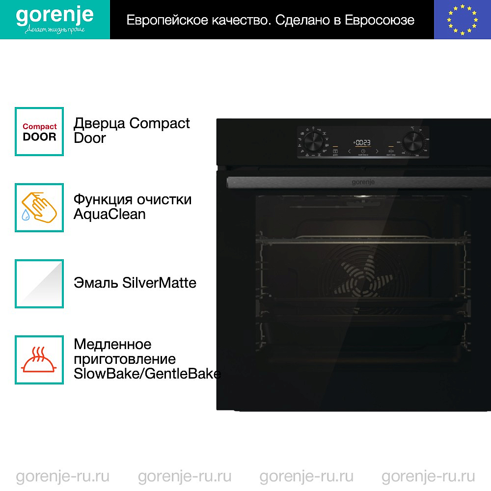 Дверца Compact Door — дверца духового шкафа Gorenje, остекленная по особой технологии. Изнутри она покрыта специальным составом. Наружный слой выполнен из обычного стекла, внутренний изготовлен из закаленного с уникальным отражающим покрытием. Между ними располагается термоизолятор. Благодаря технологии Compact Door дверца остается холодной на ощупь, даже когда духовка разогревается до 400 градусов.