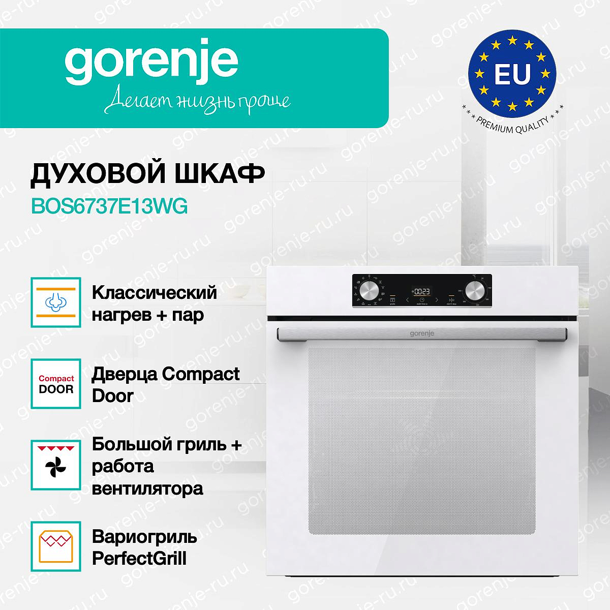 Духовой шкаф Gorenje BOS6737E13WG — это высококачественная бытовая техника, произведенная в Словении. Он обладает элегантным дизайном, с белоснежной стеклянной панелью управления и темно-серой ручкой дверцы, что придает ему современный и стильный вид.