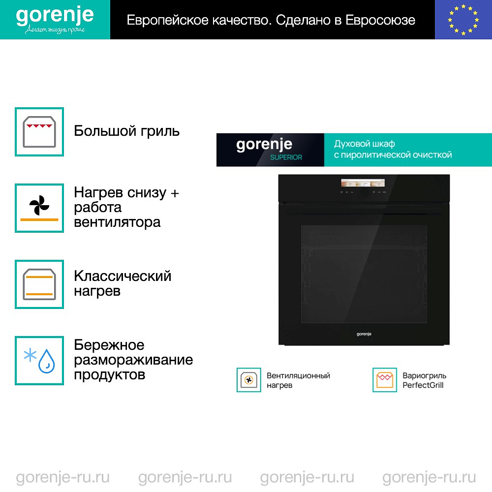 ** Все информационные материалы, представленные на Сайте, носят справочный характер и не могут в полной мере передавать достоверную информацию о свойствах, комплектации и характеристиках товара, включая цвета, размеры и формы. Фирма-производитель оставляет за собой право на внесение изменений в конструкцию, дизайн и комплектацию товара без предварительного уведомления. Перед оформлением Заказа Покупатель должен обратиться к Продавцу для уточнения свойств и характеристик Товара. Подробная информация о товаре указывается в инструкции и на упаковке товара. Используемое название в России: Горенье BOP798S37BG