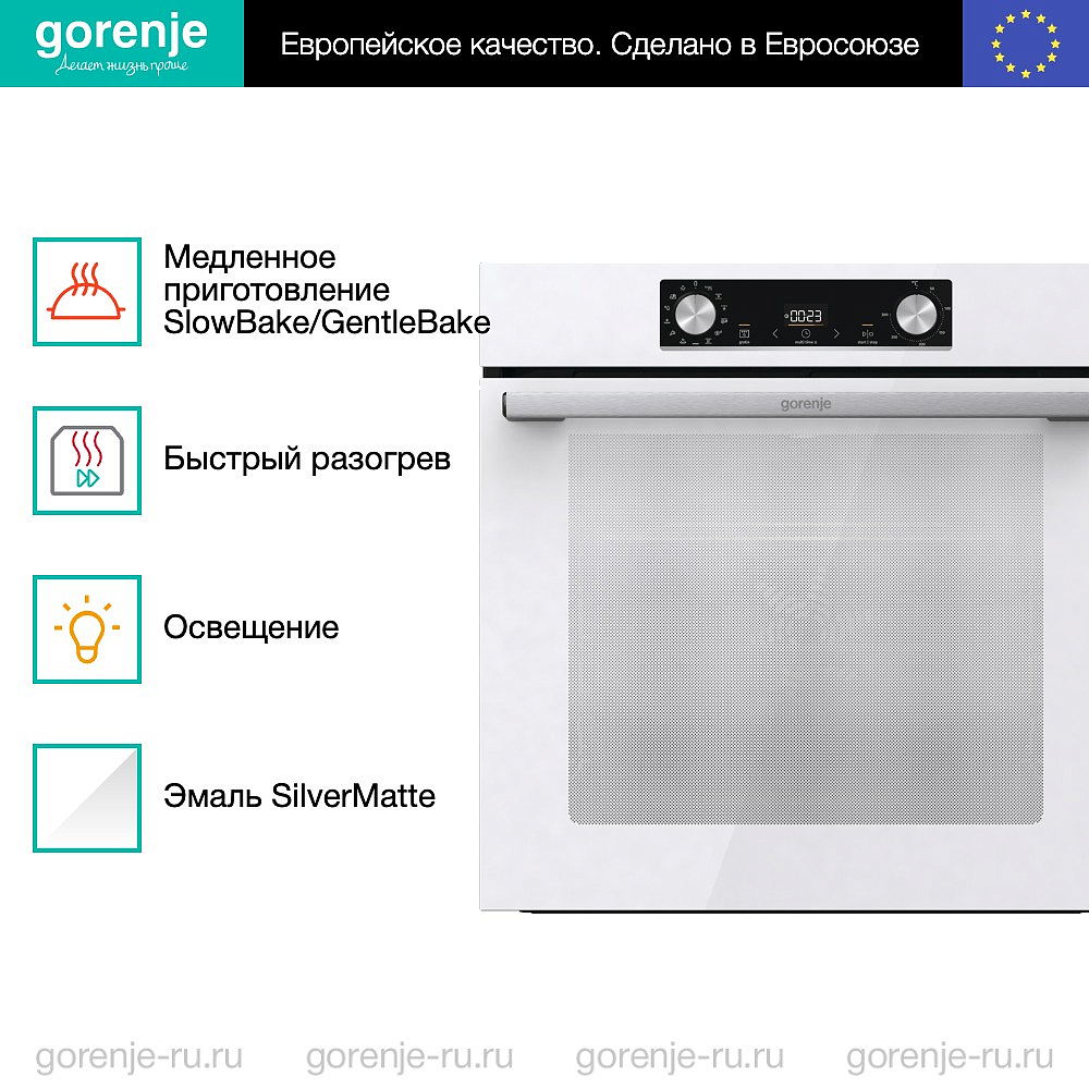 ** Все информационные материалы, представленные на Сайте, носят справочный характер и не могут в полной мере передавать достоверную информацию о свойствах, комплектации и характеристиках товара, включая цвета, размеры и формы. Фирма-производитель оставляет за собой право на внесение изменений в конструкцию, дизайн и комплектацию товара без предварительного уведомления. Перед оформлением Заказа Покупатель должен обратиться к Продавцу для уточнения свойств и характеристик Товара. Подробная информация о товаре указывается в инструкции и на упаковке товара. Используемое название в России: Горенье BOS6737E03WG