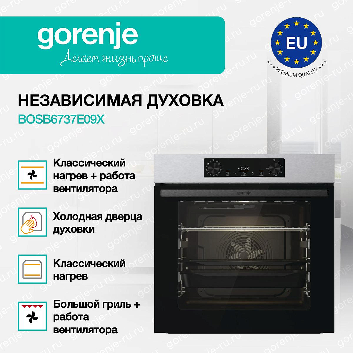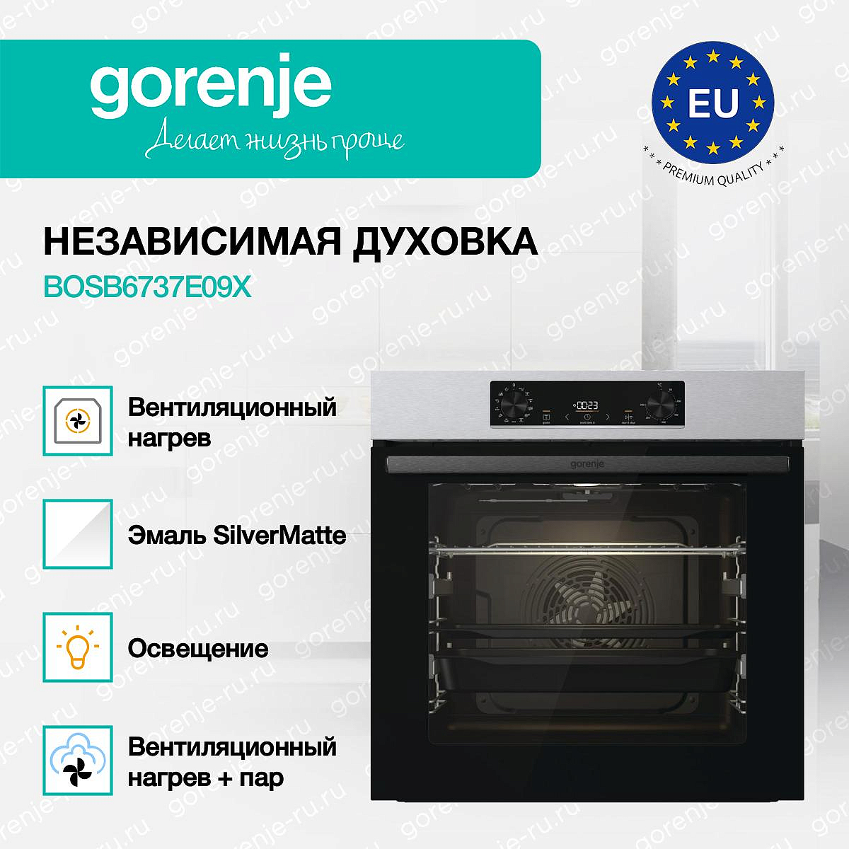 ** Все информационные материалы, представленные на Сайте, носят справочный характер и не могут в полной мере передавать достоверную информацию о свойствах, комплектации и характеристиках товара, включая цвета, размеры и формы. Фирма-производитель оставляет за собой право на внесение изменений в конструкцию, дизайн и комплектацию товара без предварительного уведомления. Перед оформлением Заказа Покупатель должен обратиться к Продавцу для уточнения свойств и характеристик Товара. Подробная информация о товаре указывается в инструкции и на упаковке товара. Используемое название в России: Горенье BOSB6737E09X