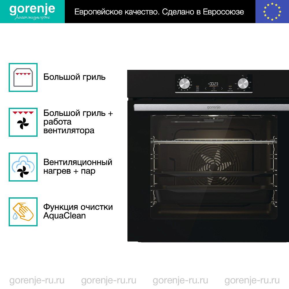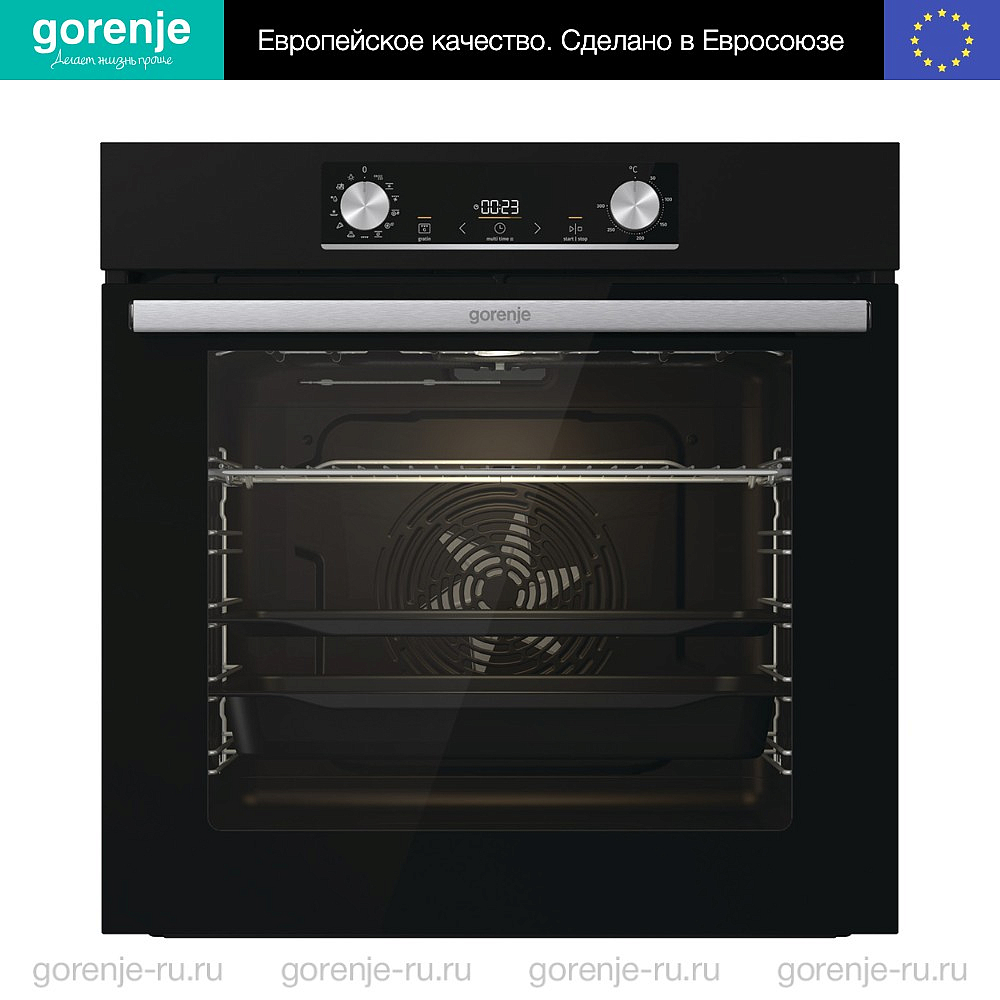 Духовой шкаф Gorenje BOSX6737E03B — это элегантное и функциональное устройство, способное украсить любую кухню. Бытовая техника линейки Essential сочетает в себе эргономичность и изящный продуманный дизайн. Корпус выполнен в глубоком черном оттенке, детали — матового серого цвета. Эта модель выглядит неброско, спокойно, но при этом изысканно. Идеальное сочетание классики и современности: простые прямые линии, лаконичный дисплей, переключатели из серебристой нержавеющей стали, утопленные в поверхность.