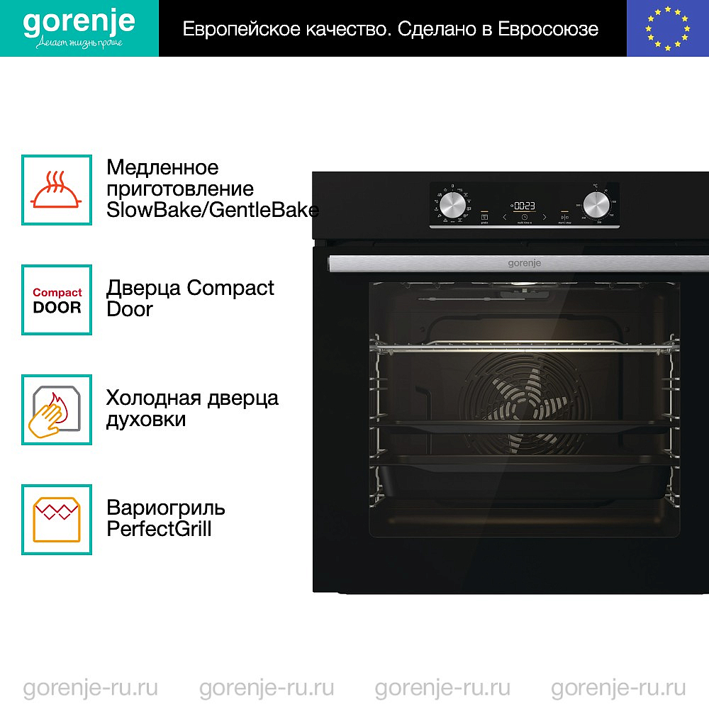 Дверца Compact Door — дверца духового шкафа Gorenje, остекленная по особой технологии. Изнутри она покрыта специальным составом. Наружный слой выполнен из обычного стекла, внутренний изготовлен из закаленного с уникальным отражающим покрытием. Между ними располагается термоизолятор. Благодаря технологии Compact Door дверца остается холодной на ощупь, даже когда духовка разогревается до 400 градусов.