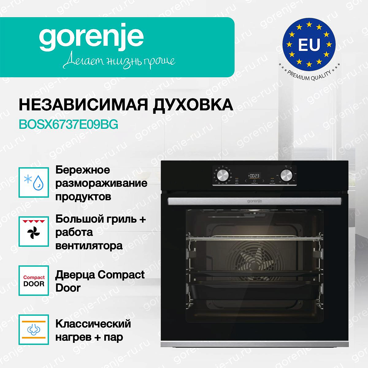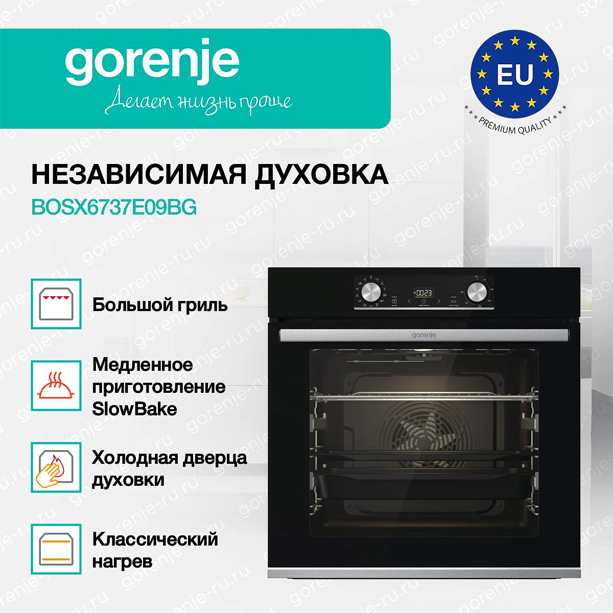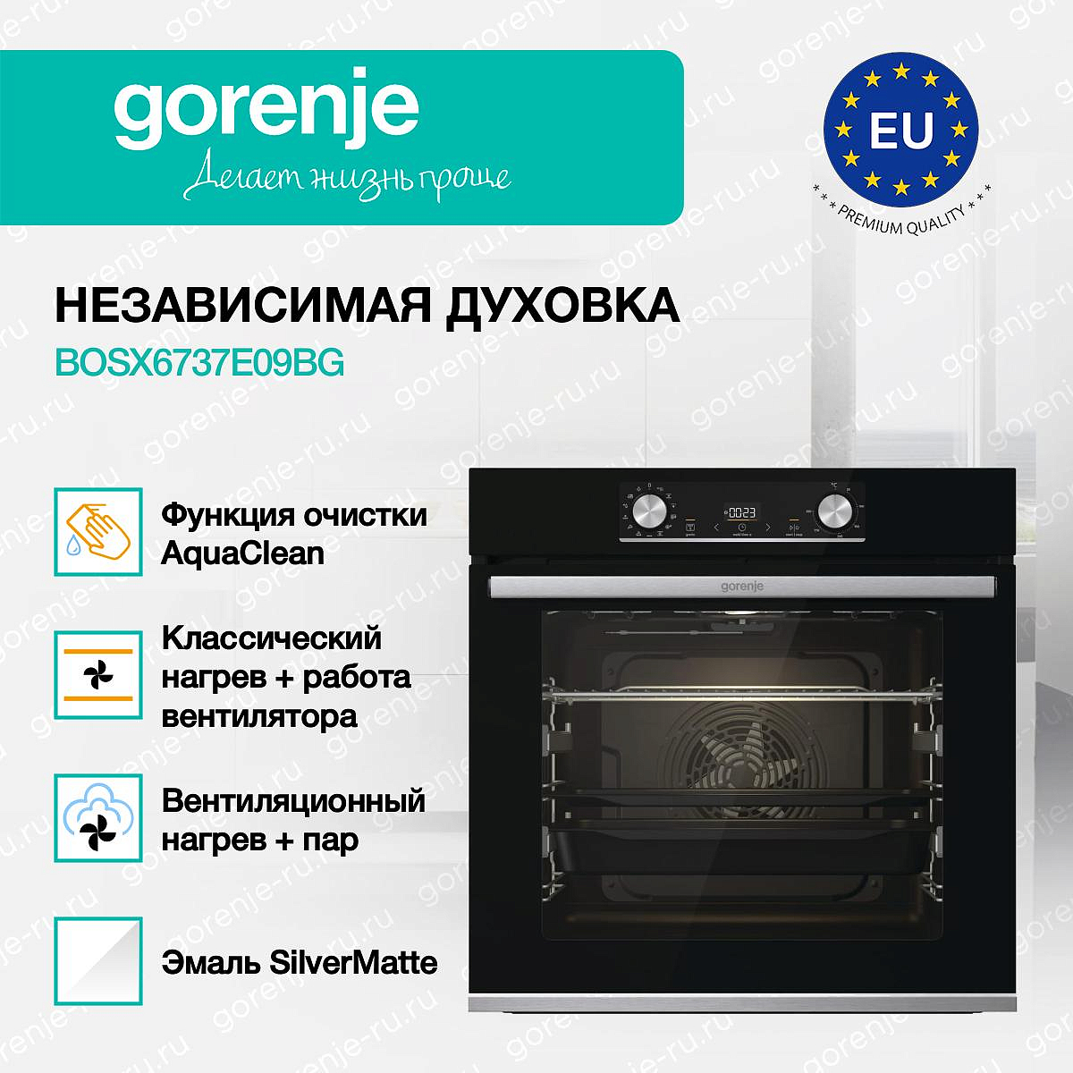 ** Все информационные материалы, представленные на Сайте, носят справочный характер и не могут в полной мере передавать достоверную информацию о свойствах, комплектации и характеристиках товара, включая цвета, размеры и формы. Фирма-производитель оставляет за собой право на внесение изменений в конструкцию, дизайн и комплектацию товара без предварительного уведомления. Перед оформлением Заказа Покупатель должен обратиться к Продавцу для уточнения свойств и характеристик Товара. Подробная информация о товаре указывается в инструкции и на упаковке товара. Используемое название в России: Горенье BOSX6737E09BG
