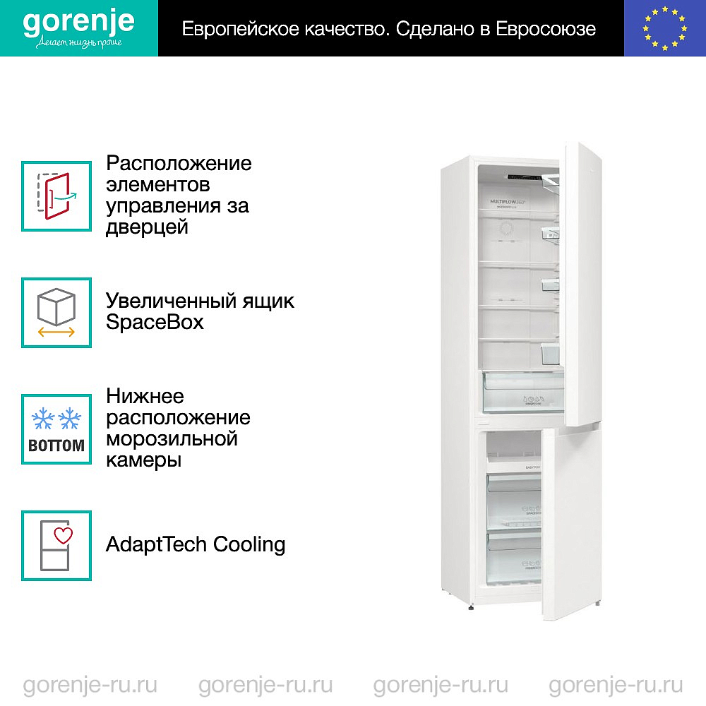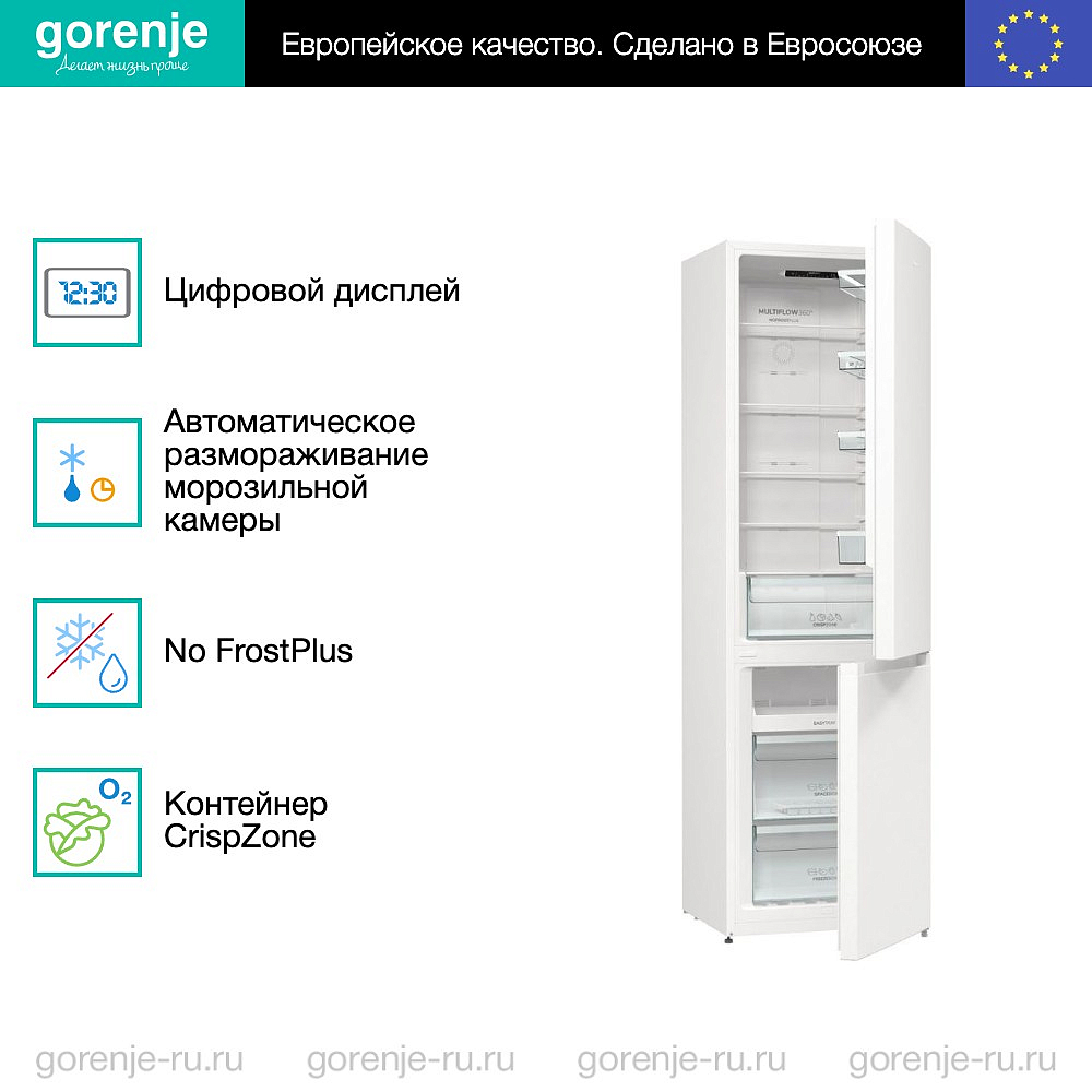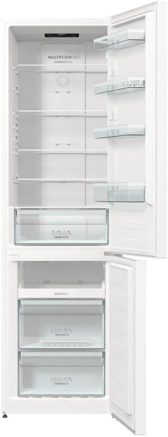 Отдельностоящий двухкамерный холодильник Gorenje NRK6201PW4 с шириной 60 см., благодаря технологии Slot-In может быть установлен в нишу соответствующего размера. При этом все полки и ящики можно выдвинуть. С AdaptTech Cooling модель анализирует время, в которое дверца открывается чаще всего, и подстраивается под ваше расписание: в данные промежутки температура внутри понижается, что позволяет избежать перегрева продуктов. MultiFlow 360° отвечает за равномерное распределение холодного воздуха по всем полкам, сохраняя еду свежей как можно дольше. Помимо автоматической разморозки обоих отделений, устройство оснащено функцией NoFrost Plus, при которой на стенках и полках не образуются иней или отложения льда, что продлевает срок службы и упрощает поддержание прибора в чистоте. Дверные полки можно переставлять на удобную для вас высоту.