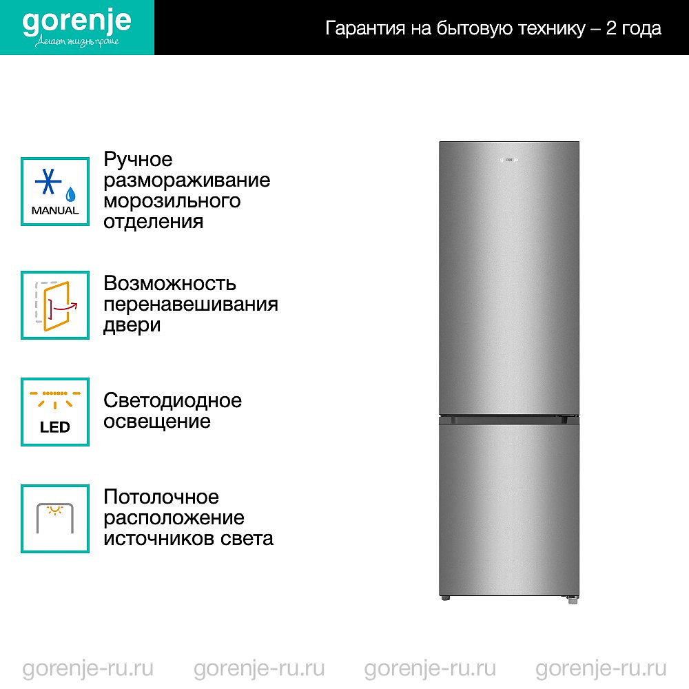 Отдельностоящий двухкамерный холодильник Gorenje RK4181PS4 выполнен в цвете нержавеющая сталь. Модель двухкамерная, с полезным объемом холодильной и морозильной камеры — 198 и 66 л. соответственно. Разморозка ручная. Дверца сделана из качественного металла. Управление механическое, а элементы удобно расположены внутри устройства. Это упрощает эксплуатацию прибора. Есть возможность выбрать необходимую вам температуру. Освещение светодиодное — оно обеспечивает равномерное распределение яркого света по всей камере вне зависимости от степени наполнения полок. При этом такие лампы служат долго, не нуждаются в замене, не греются и потребляют куда меньше электроэнергии.