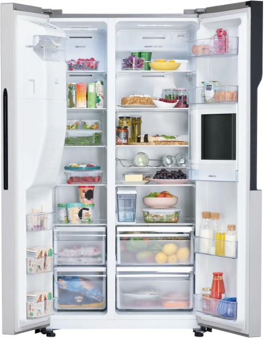 Внутреннее пространство организовано максимально эффективно: пять прочных стеклянных полок, металлическая полка для бутылок, пять полок на дверце и два вместительных контейнера для овощей и фруктов обеспечивают удобное размещение всех продуктов. Для мелочей предусмотрен специальный лоток для яиц или льда, а также отсек HomeBar, который упрощает доступ к часто используемым напиткам. Освещение реализовано светодиодными модулями, равномерно подсвечивающими все полки. Система MultiFlow360 в сочетании с функцией QuickCooling гарантирует равномерное распределение холода по всему объему. Технология Total NoFrost исключает необходимость ручной разморозки, а режимы FastFreeze и SuperCool позволяют быстро замораживать и охлаждать свежие продукты, сохраняя их качество.