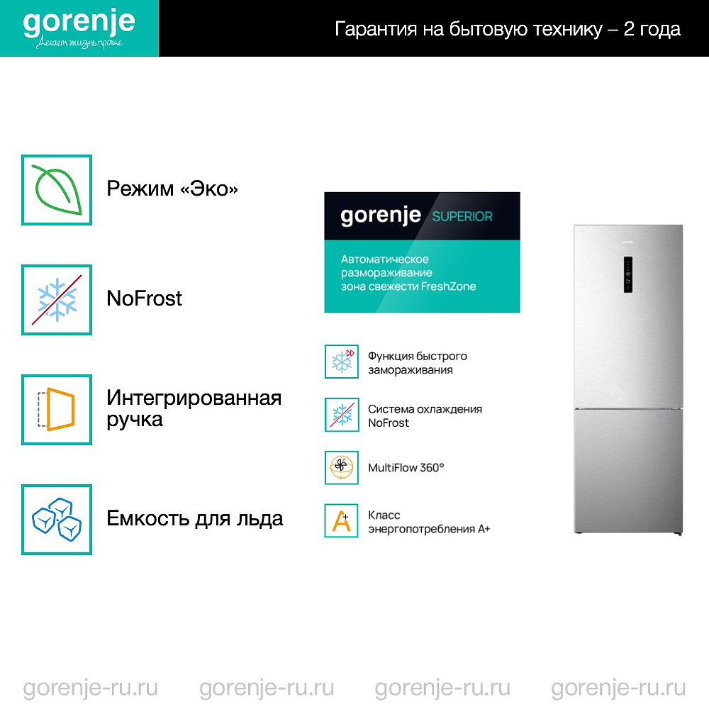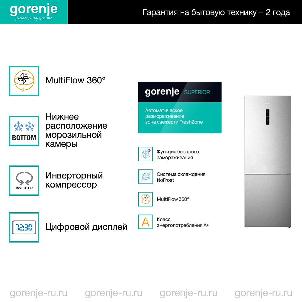 Техника оснащена системой интенсивной циркуляции воздуха MultiFlow360, которая обеспечивает равномерное охлаждение всех продуктов, независимо от их расположения. Вместе с системой охлаждения No Frost, которая предотвращает образование инея и наледи, эта технология позволяет сохранять продукты свежими и вкусными на протяжении долгого времени.