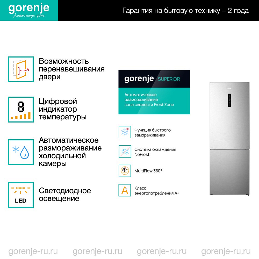 На всю бытовую технику Gorenje, представленную в нашем интернет-магазине, действует официальная гарантия — 2 года со дня покупки. В течение первого года проводится гарантийное обслуживание и ремонт, во второй года — бесплатное сервисное обслуживание. Если срок гарантии не истек, неисправность будет устранена в сервисном центре. Если гарантия закончилась, можно отремонтировать технику у наших партнеров. Аксессуары и запасные части, приобретаемые отдельно и не включенные в комплектацию прибора, не покрываются гарантией. Ремонт по гарантии не влечет расширения или продления гарантийного срока.