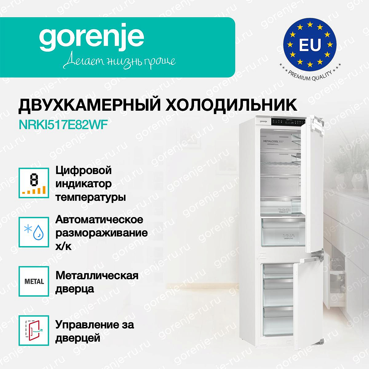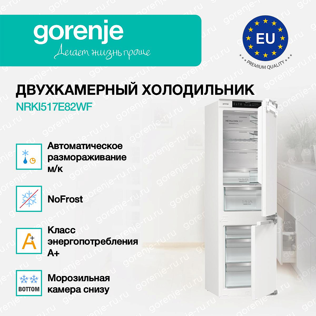 ** Все информационные материалы, представленные на Сайте, носят справочный характер и не могут в полной мере передавать достоверную информацию о свойствах, комплектации и характеристиках товара, включая цвета, размеры и формы. Фирма-производитель оставляет за собой право на внесение изменений в конструкцию, дизайн и комплектацию товара без предварительного уведомления. Перед оформлением Заказа Покупатель должен обратиться к Продавцу для уточнения свойств и характеристик Товара. Подробная информация о товаре указывается в инструкции и на упаковке товара. Используемое название в России: Горенье NRKI517E82WF