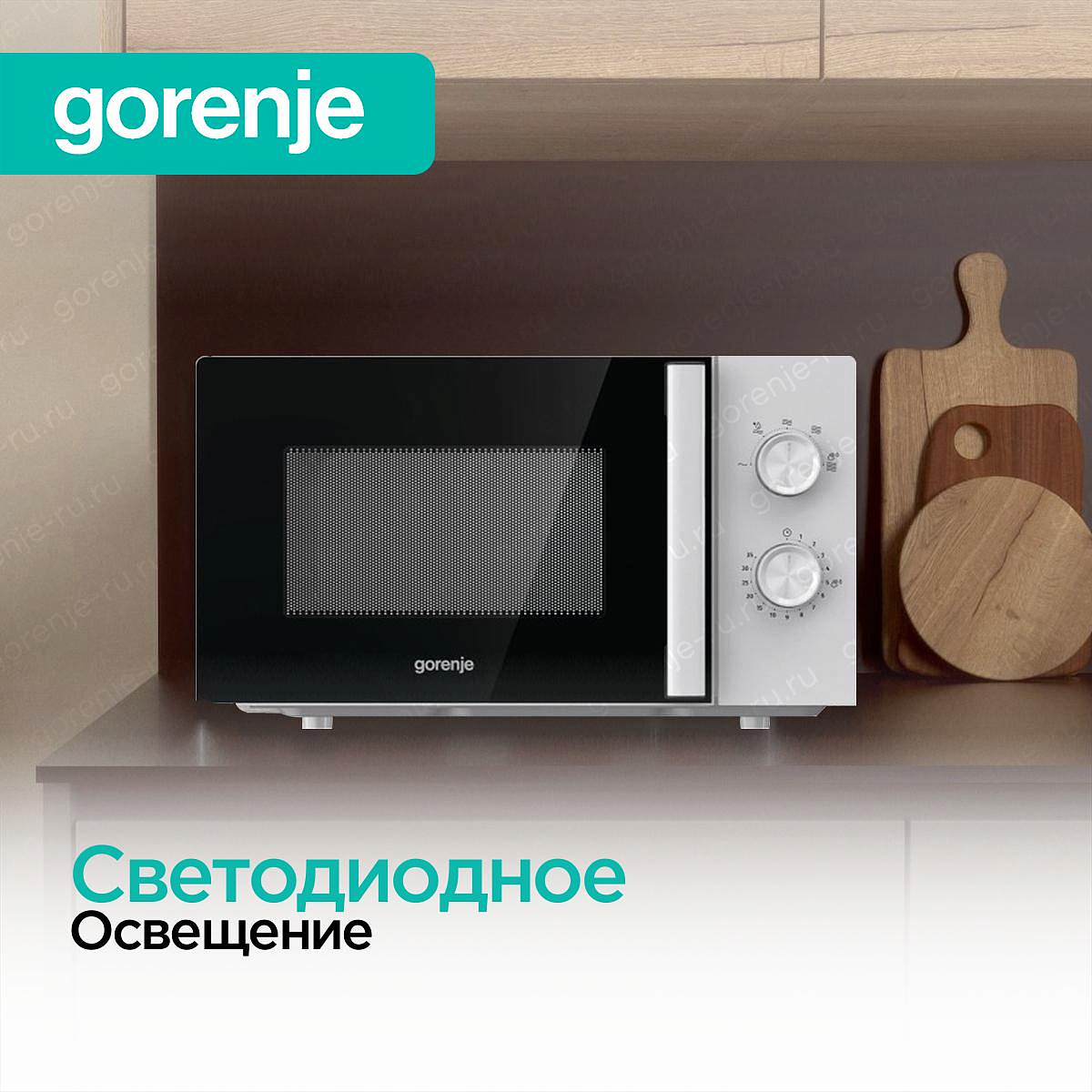 Светодиодное освещение в отдельностоящих микроволновках Gorenje — это яркая, энергоэффективная и долговечная подсветка внутренней камеры. LED-лампы автоматически включаются при открытии дверцы и во время работы, позволяя чётко видеть процесс разогрева или готовки без прерывания цикла. Они не нагреваются, потребляют минимум энергии и служат значительно дольше галогенных аналогов. Благодаря равномерному свету легко контролировать степень прожарки или равномерность разогрева.
