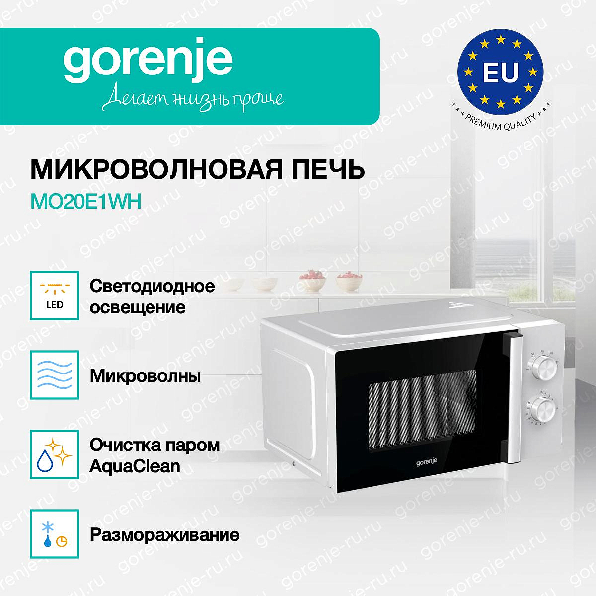 ** Все информационные материалы, представленные на Сайте, носят справочный характер и не могут в полной мере передавать достоверную информацию о свойствах, комплектации и характеристиках товара, включая цвета, размеры и формы. Фирма-производитель оставляет за собой право на внесение изменений в конструкцию, дизайн и комплектацию товара без предварительного уведомления. Перед оформлением Заказа Покупатель должен обратиться к Продавцу для уточнения свойств и характеристик Товара. Подробная информация о товаре указывается в инструкции и на упаковке товара. Используемое название в России: Горенье MO20E1WH