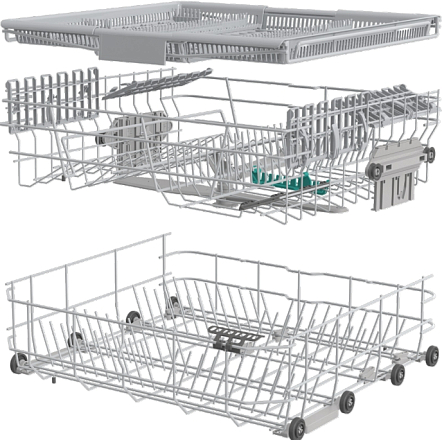 Устройство оборудовано тремя корзинами, верхняя из которых регулируется по высоте, что позволяет оптимизировать пространство под разные виды посуды. Кроме того, в модели предусмотрены складные держатели для тарелок и специальный держатель для ножей, что обеспечивает максимально эффективное использование пространства.
