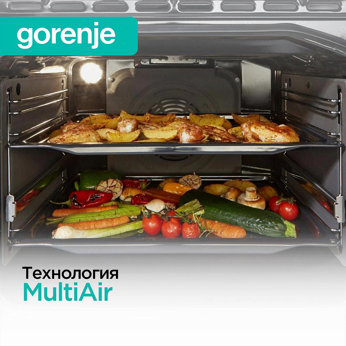 Технология MultiAir, применяемая в духовых шкафах (чаще всего бренда Gorenje), представляет собой систему распределения нагретого воздуха. Она работает за счёт вентилятора, отверстий в задней панели духовки и специальной округлой формы внутренней камеры. Такое решение позволяет готовить блюда сразу на нескольких уровнях с равномерной тепловой обработкой и без передачи запахов между продуктами.