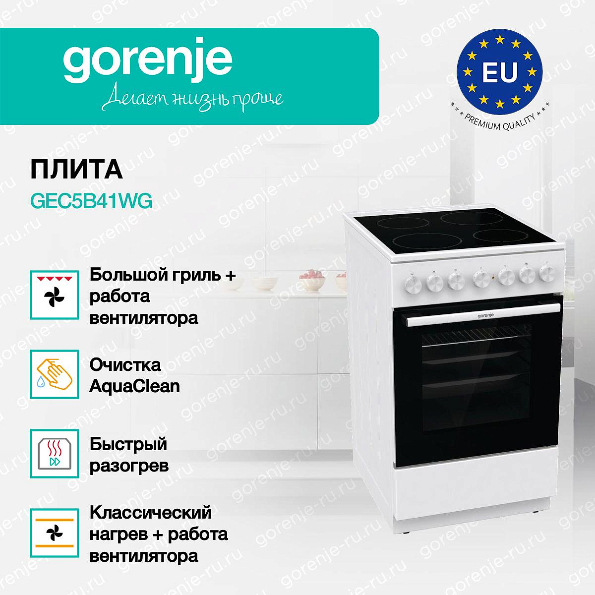 ** Все информационные материалы, представленные на Сайте, носят справочный характер и не могут в полной мере передавать достоверную информацию о свойствах, комплектации и характеристиках товара, включая цвета, размеры и формы. Фирма-производитель оставляет за собой право на внесение изменений в конструкцию, дизайн и комплектацию товара без предварительного уведомления. Перед оформлением Заказа Покупатель должен обратиться к Продавцу для уточнения свойств и характеристик Товара. Подробная информация о товаре указывается в инструкции и на упаковке товара. Используемое название в России: Горенье GEC5B41WG