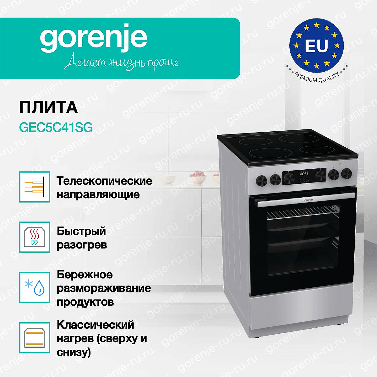 ** Все информационные материалы, представленные на Сайте, носят справочный характер и не могут в полной мере передавать достоверную информацию о свойствах, комплектации и характеристиках товара, включая цвета, размеры и формы. Фирма-производитель оставляет за собой право на внесение изменений в конструкцию, дизайн и комплектацию товара без предварительного уведомления. Перед оформлением Заказа Покупатель должен обратиться к Продавцу для уточнения свойств и характеристик Товара. Подробная информация о товаре указывается в инструкции и на упаковке товара. Используемое название в России: Горенье GEC5C41SG