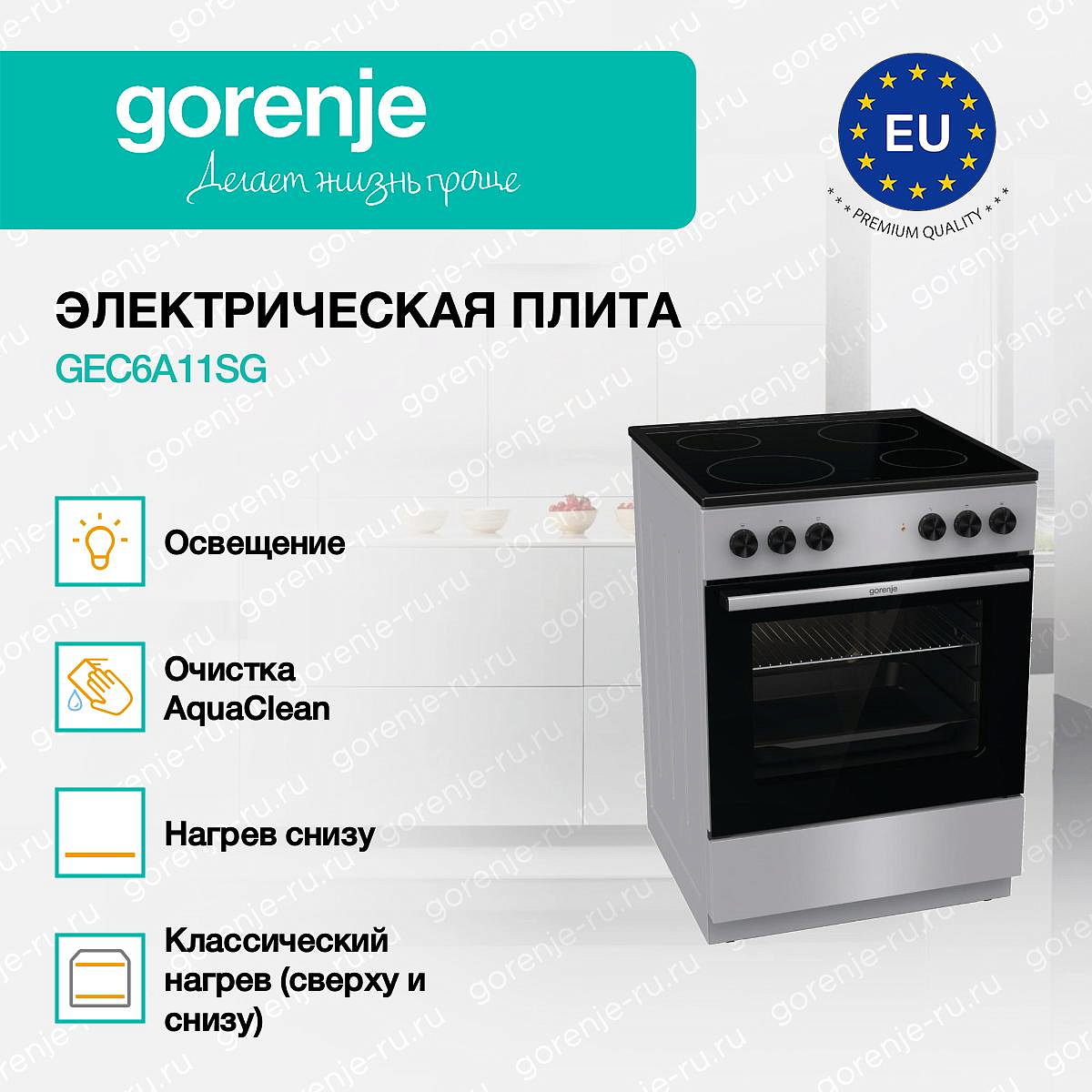** Все информационные материалы, представленные на Сайте, носят справочный характер и не могут в полной мере передавать достоверную информацию о свойствах, комплектации и характеристиках товара, включая цвета, размеры и формы. Фирма-производитель оставляет за собой право на внесение изменений в конструкцию, дизайн и комплектацию товара без предварительного уведомления. Перед оформлением Заказа Покупатель должен обратиться к Продавцу для уточнения свойств и характеристик Товара. Подробная информация о товаре указывается в инструкции и на упаковке товара. Используемое название в России: Горенье GEC6A11SG