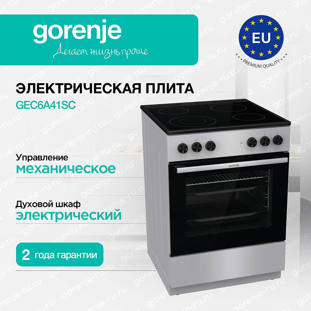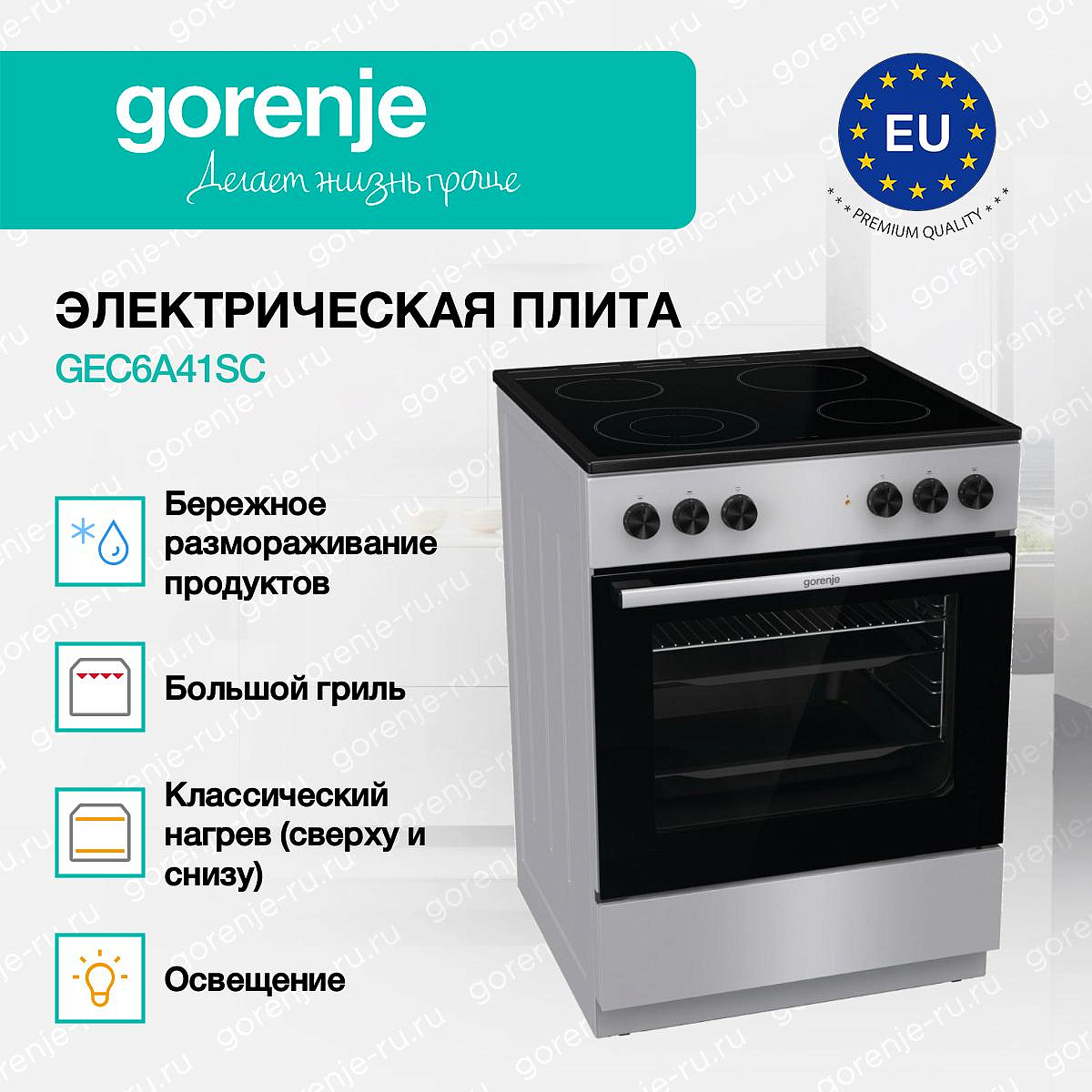 ** Все информационные материалы, представленные на Сайте, носят справочный характер и не могут в полной мере передавать достоверную информацию о свойствах, комплектации и характеристиках товара, включая цвета, размеры и формы. Фирма-производитель оставляет за собой право на внесение изменений в конструкцию, дизайн и комплектацию товара без предварительного уведомления. Перед оформлением Заказа Покупатель должен обратиться к Продавцу для уточнения свойств и характеристик Товара. Подробная информация о товаре указывается в инструкции и на упаковке товара. Используемое название в России: Горенье GEC6A41SC