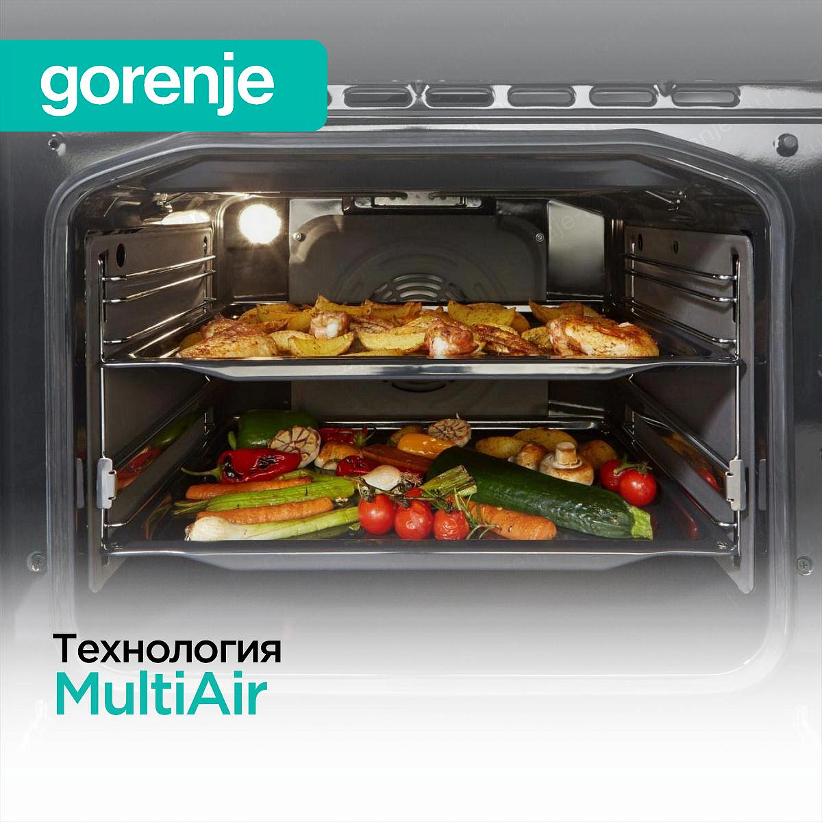 Технология MultiAir, применяемая в духовых шкафах (чаще всего бренда Gorenje), представляет собой систему распределения нагретого воздуха. Она работает за счёт вентилятора, отверстий в задней панели духовки и специальной округлой формы внутренней камеры. Такое решение позволяет готовить блюда сразу на нескольких уровнях с равномерной тепловой обработкой и без передачи запахов между продуктами.
