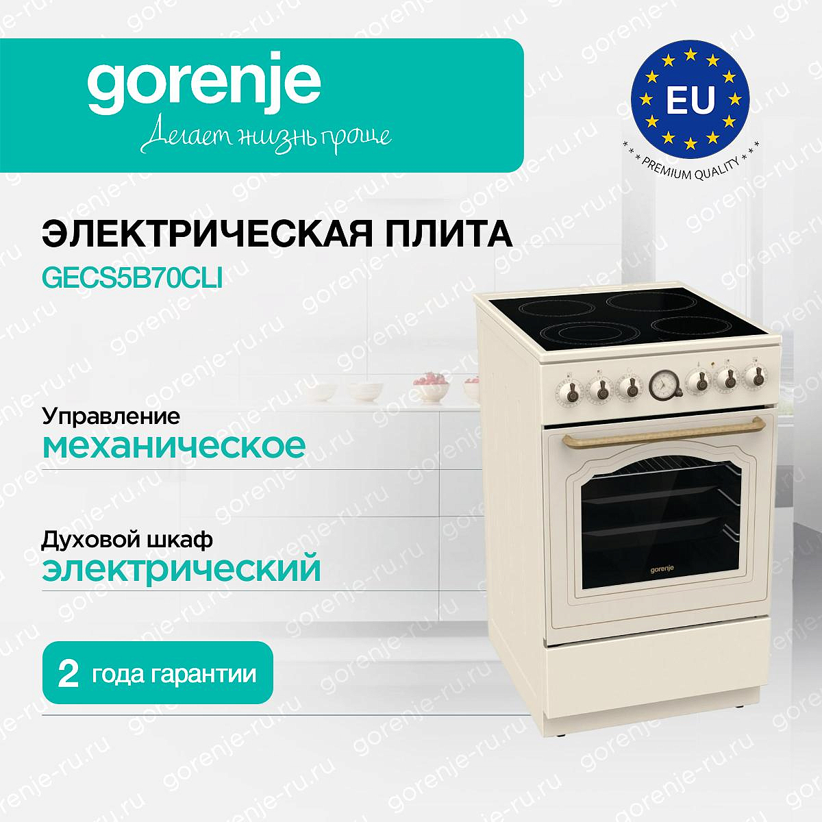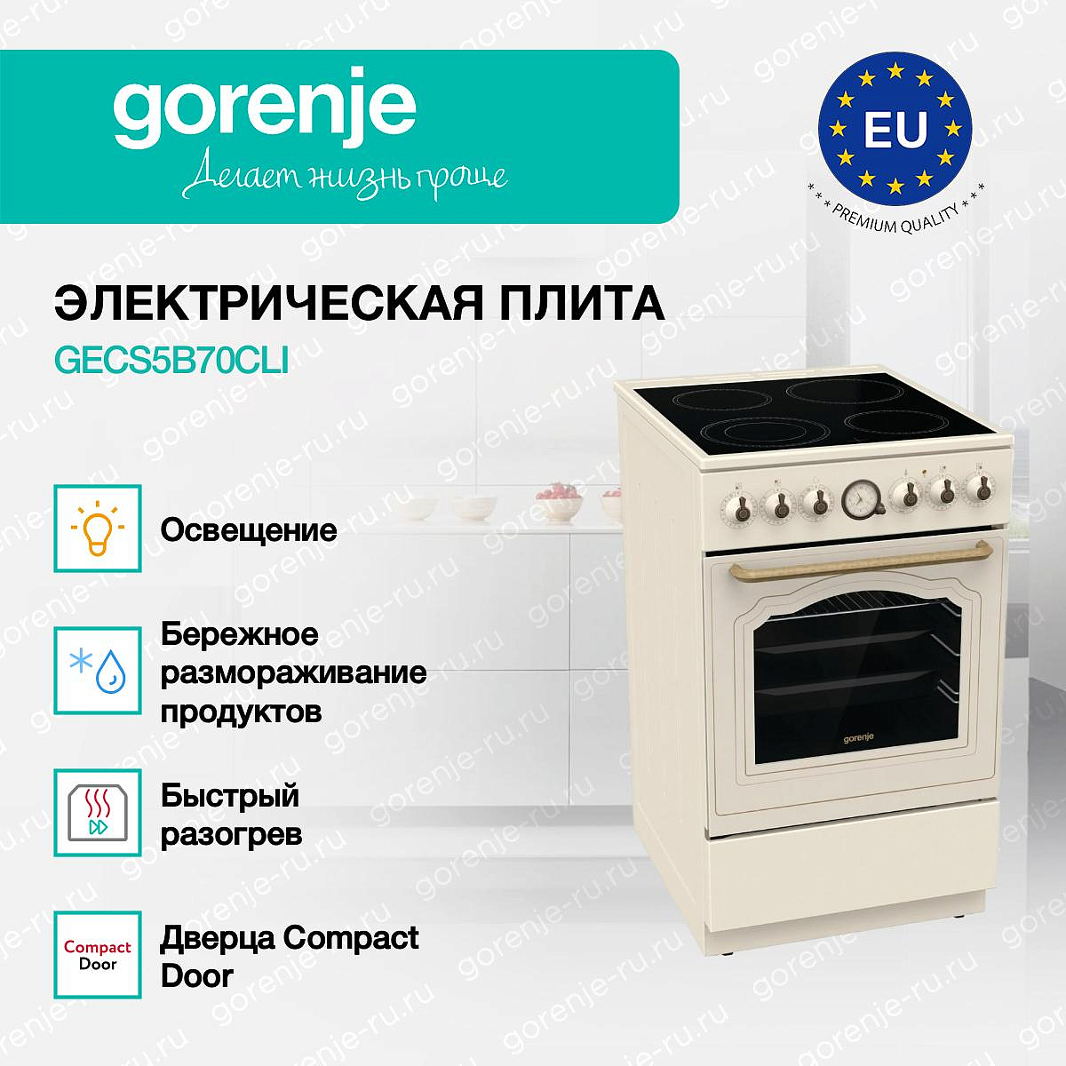 ** Все информационные материалы, представленные на Сайте, носят справочный характер и не могут в полной мере передавать достоверную информацию о свойствах, комплектации и характеристиках товара, включая цвета, размеры и формы. Фирма-производитель оставляет за собой право на внесение изменений в конструкцию, дизайн и комплектацию товара без предварительного уведомления. Перед оформлением Заказа Покупатель должен обратиться к Продавцу для уточнения свойств и характеристик Товара. Подробная информация о товаре указывается в инструкции и на упаковке товара. Используемое название в России: Горенье GECS5B70CLI
