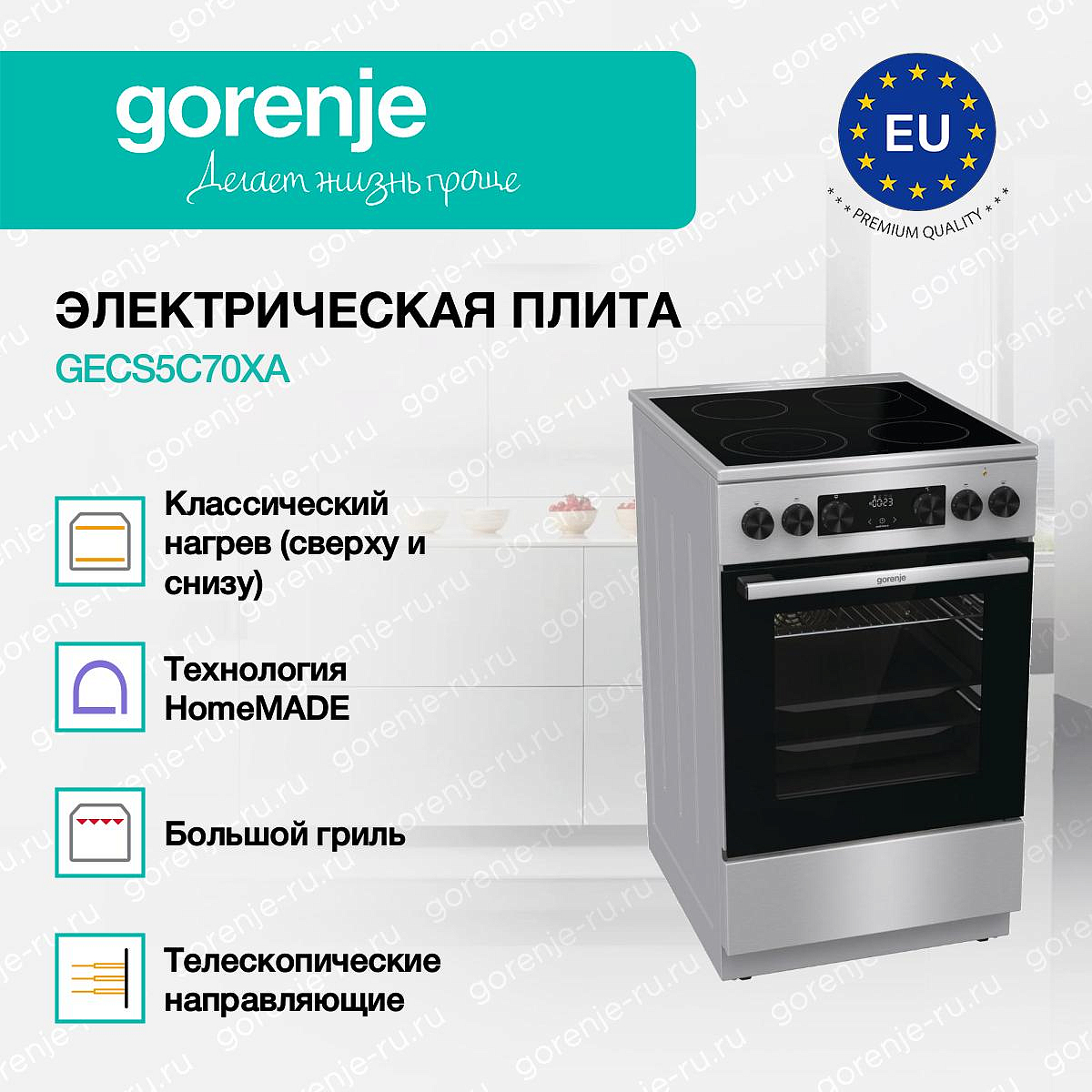 ** Все информационные материалы, представленные на Сайте, носят справочный характер и не могут в полной мере передавать достоверную информацию о свойствах, комплектации и характеристиках товара, включая цвета, размеры и формы. Фирма-производитель оставляет за собой право на внесение изменений в конструкцию, дизайн и комплектацию товара без предварительного уведомления. Перед оформлением Заказа Покупатель должен обратиться к Продавцу для уточнения свойств и характеристик Товара. Подробная информация о товаре указывается в инструкции и на упаковке товара. Используемое название в России: Горенье GECS5C70XA
