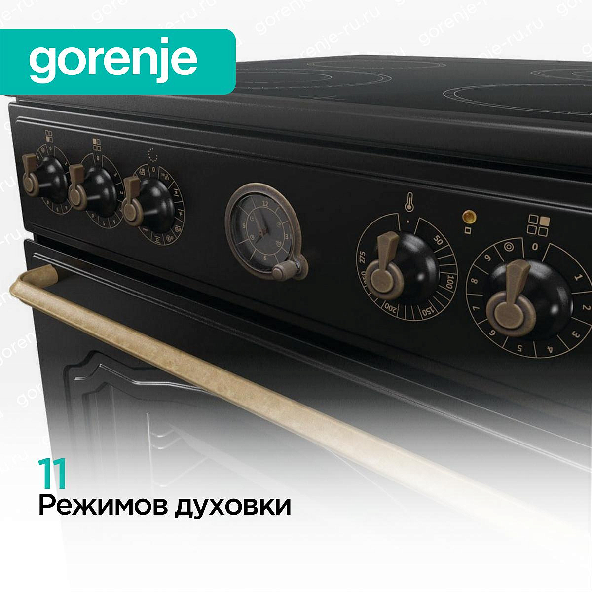 Электрическая плита Gorenje GECS6B70CLB элегантного черного цвета органично дополнит современную или классическую кухню. Она выполнена в ретро дизайне и станет не только функциональным прибором, но и настоящим украшением интерьера. Переключатели бронзового цвета подчеркивают общее оформление. Ручки эргономичные. Вы легко сможете отрегулировать нагрев. Варочная поверхность стеклокерамическая. Ее можно мыть мягкими чистящими средствами. Часы с аналоговым циферблатом помогут вам контролировать время готовки. Можно настроить таймер. Установите нужное время, сигнал напомнит вам о том, что прибор пора выключить. Общее количество конфорок — четыре. Две из них двухконтурные. Благодаря этому вы можете использовать посуду разного размера.