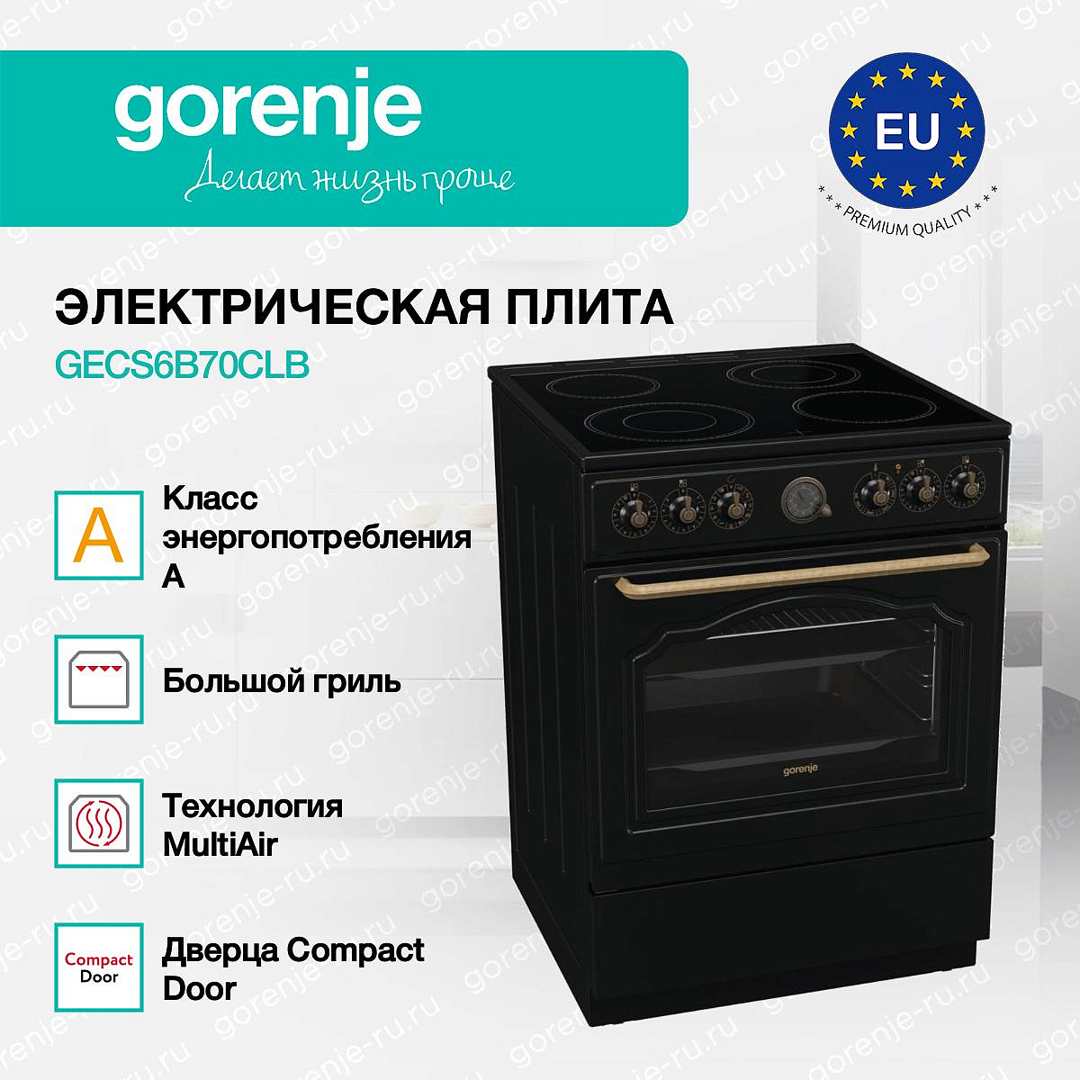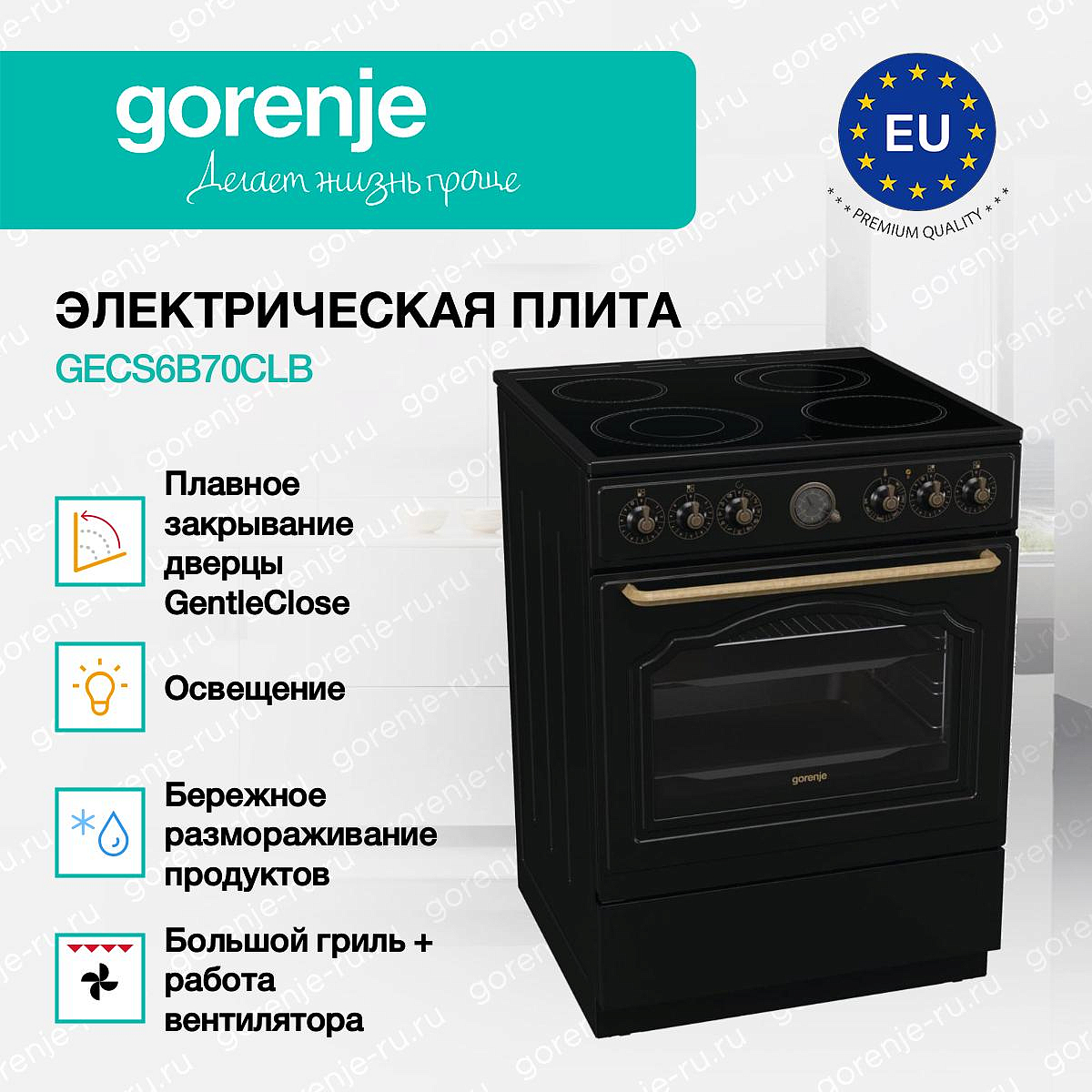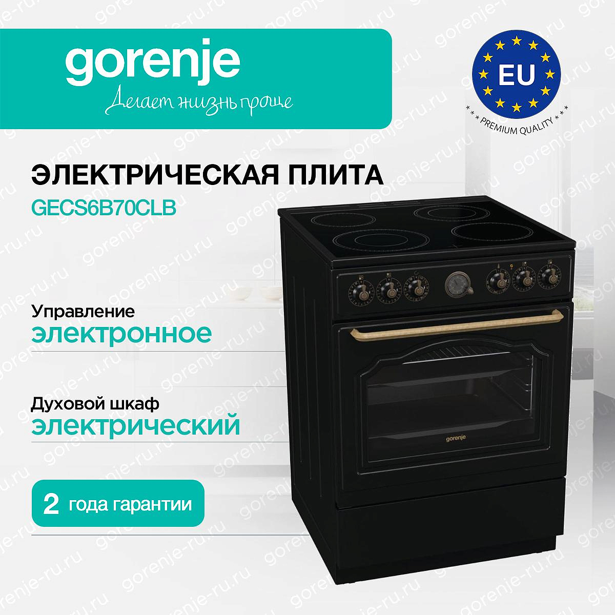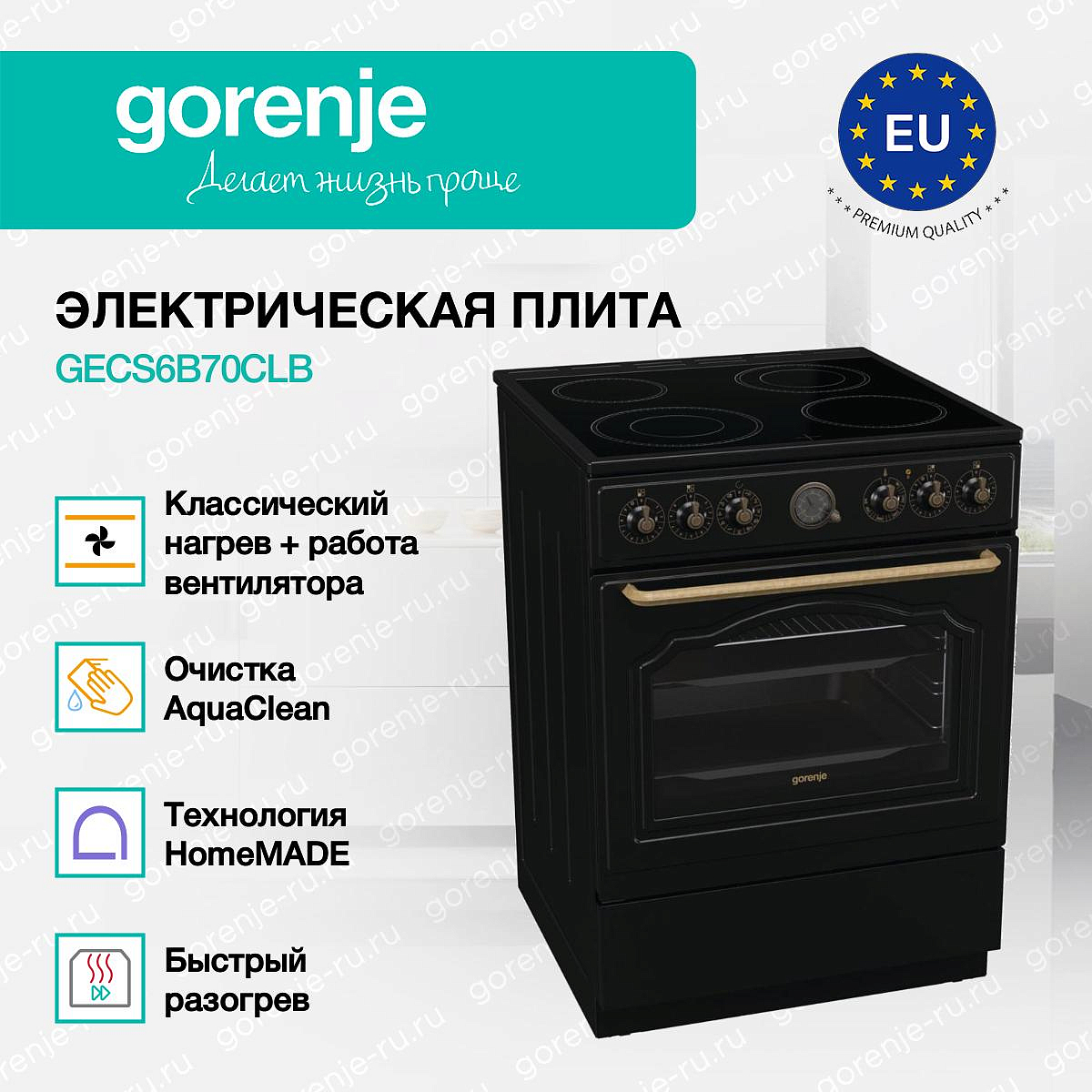 ** Все информационные материалы, представленные на Сайте, носят справочный характер и не могут в полной мере передавать достоверную информацию о свойствах, комплектации и характеристиках товара, включая цвета, размеры и формы. Фирма-производитель оставляет за собой право на внесение изменений в конструкцию, дизайн и комплектацию товара без предварительного уведомления. Перед оформлением Заказа Покупатель должен обратиться к Продавцу для уточнения свойств и характеристик Товара. Подробная информация о товаре указывается в инструкции и на упаковке товара. Используемое название в России: Горенье GECS6B70CLB