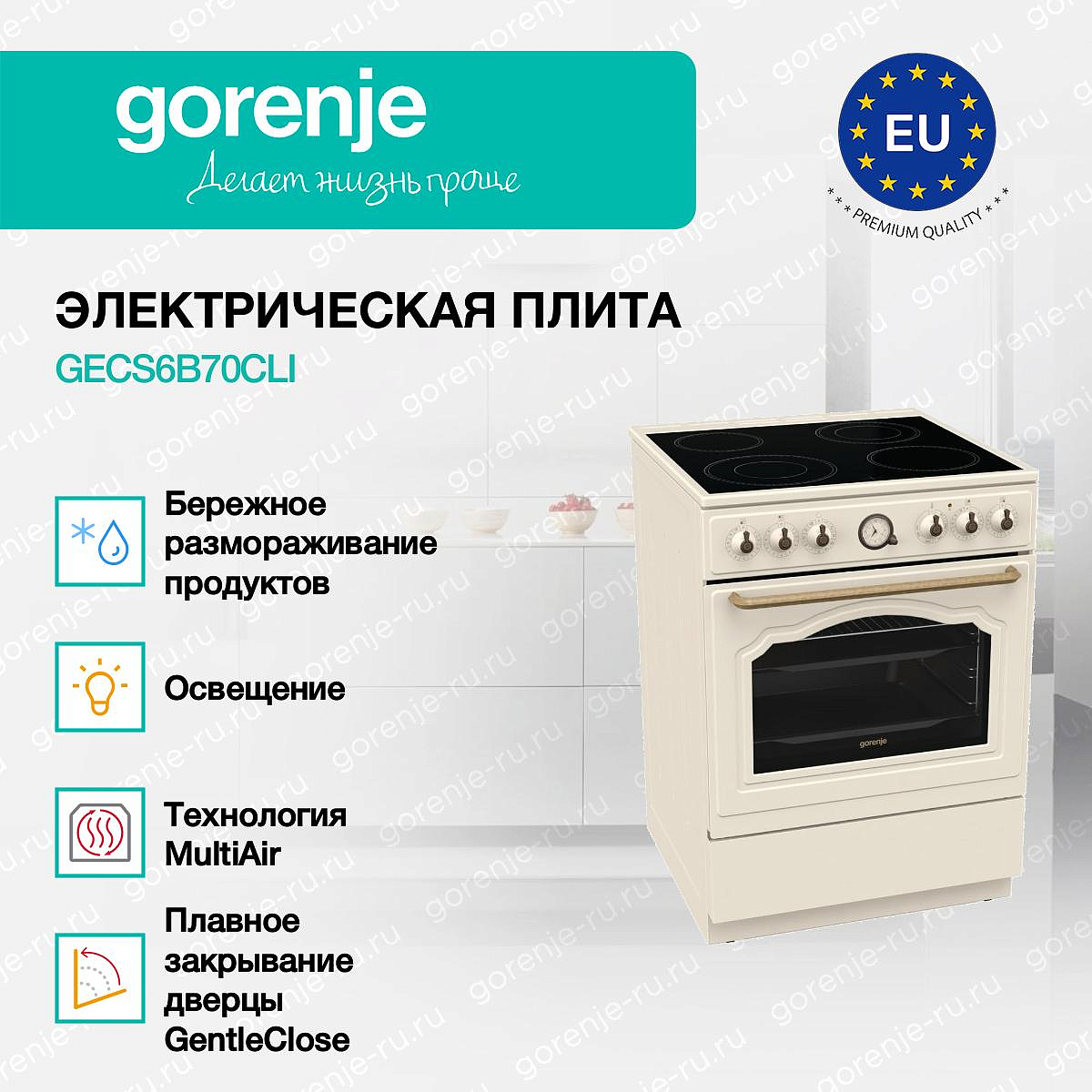 ** Все информационные материалы, представленные на Сайте, носят справочный характер и не могут в полной мере передавать достоверную информацию о свойствах, комплектации и характеристиках товара, включая цвета, размеры и формы. Фирма-производитель оставляет за собой право на внесение изменений в конструкцию, дизайн и комплектацию товара без предварительного уведомления. Перед оформлением Заказа Покупатель должен обратиться к Продавцу для уточнения свойств и характеристик Товара. Подробная информация о товаре указывается в инструкции и на упаковке товара. Используемое название в России: Горенье GECS6B70CLI