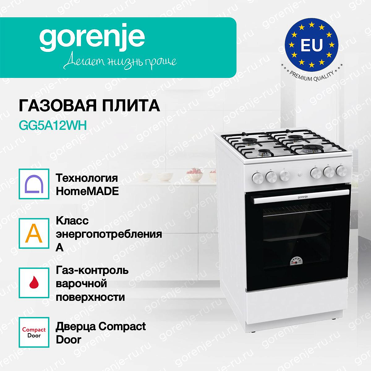 ** Все информационные материалы, представленные на Сайте, носят справочный характер и не могут в полной мере передавать достоверную информацию о свойствах, комплектации и характеристиках товара, включая цвета, размеры и формы. Фирма-производитель оставляет за собой право на внесение изменений в конструкцию, дизайн и комплектацию товара без предварительного уведомления. Перед оформлением Заказа Покупатель должен обратиться к Продавцу для уточнения свойств и характеристик Товара. Подробная информация о товаре указывается в инструкции и на упаковке товара. Используемое название в России: Горенье GG5A12WH