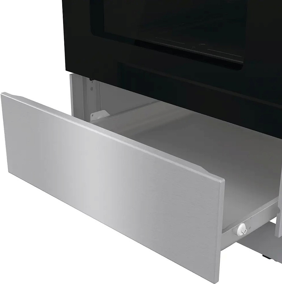 Плита оснащена выдвижным ящиком для удобного хранения кухонных принадлежностей. В комплект входят съемные направляющие, решетка, мелкий и глубокий эмалированный противень, а также решетка-подставка для турки. Все это делает процесс приготовления пищи максимально удобным и простым.