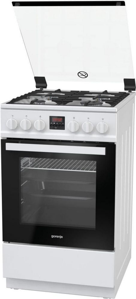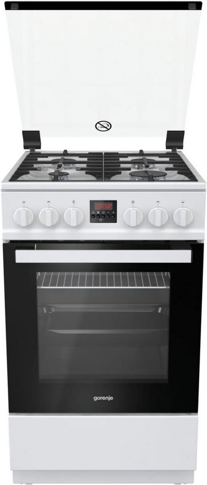 Газовая плита Gorenje GI5322WF-B — удобная техника с электронным программатором. Поверхность покрыта белой эмалью, дверца выполнена из чёрного стекла. На панель управления вынесено шесть поворотных переключателей и удобный экран. Четыре регулятора могут контролировать мощность пламени горелок варочной панели, ещё один — отвечает за духовой шкаф и последний включает подсветку рабочей камеры. Дисплей отображает текущее время. Если вы захотите воспользоваться таймером, то можете задать автоматическое отключение по истечении времени для конкретной конфорки или духовки. По окончании раздастся звуковой сигнал.