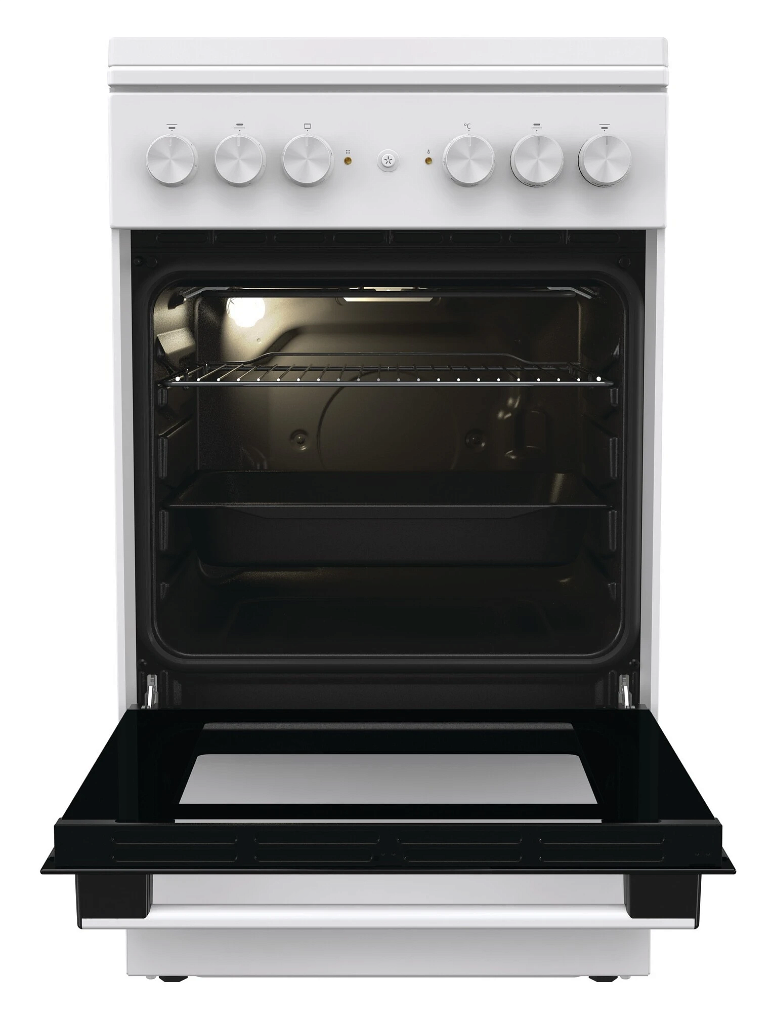 Панель управления и дверца духовки выполнены из крашеного металла с стеклянной вставкой, что обеспечивает их долговечность и устойчивость к повреждениям. Электрический духовой шкаф имеет внутренний объем 71 литр и оборудован 4 функциями нагрева. Внутреннее покрытие духовки выполнено из эмали SilverMatte, которое обеспечивает равномерное распределение тепла и предотвращает пригорание пищи. Дверца духовки оснащена двумя стеклами и одним теплоотражающим слоем, что обеспечивает эффективное сохранение тепла внутри духовки и уменьшает риск обжига при касании дверцы. Управление плитой осуществляется с помощью механических поворотных переключателей эргономичной формы. Варочная поверхность оснащена газ-контролем и электроподжигом кнопкой, что обеспечивает безопасность и удобство использования. Она также оснащена рельефными направляющими, решеткой и глубоким эмалированным противнем.
