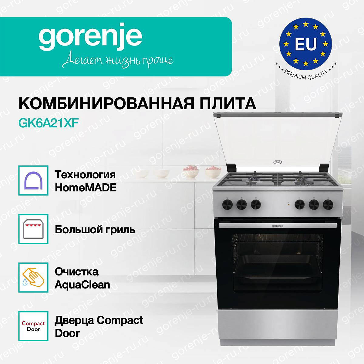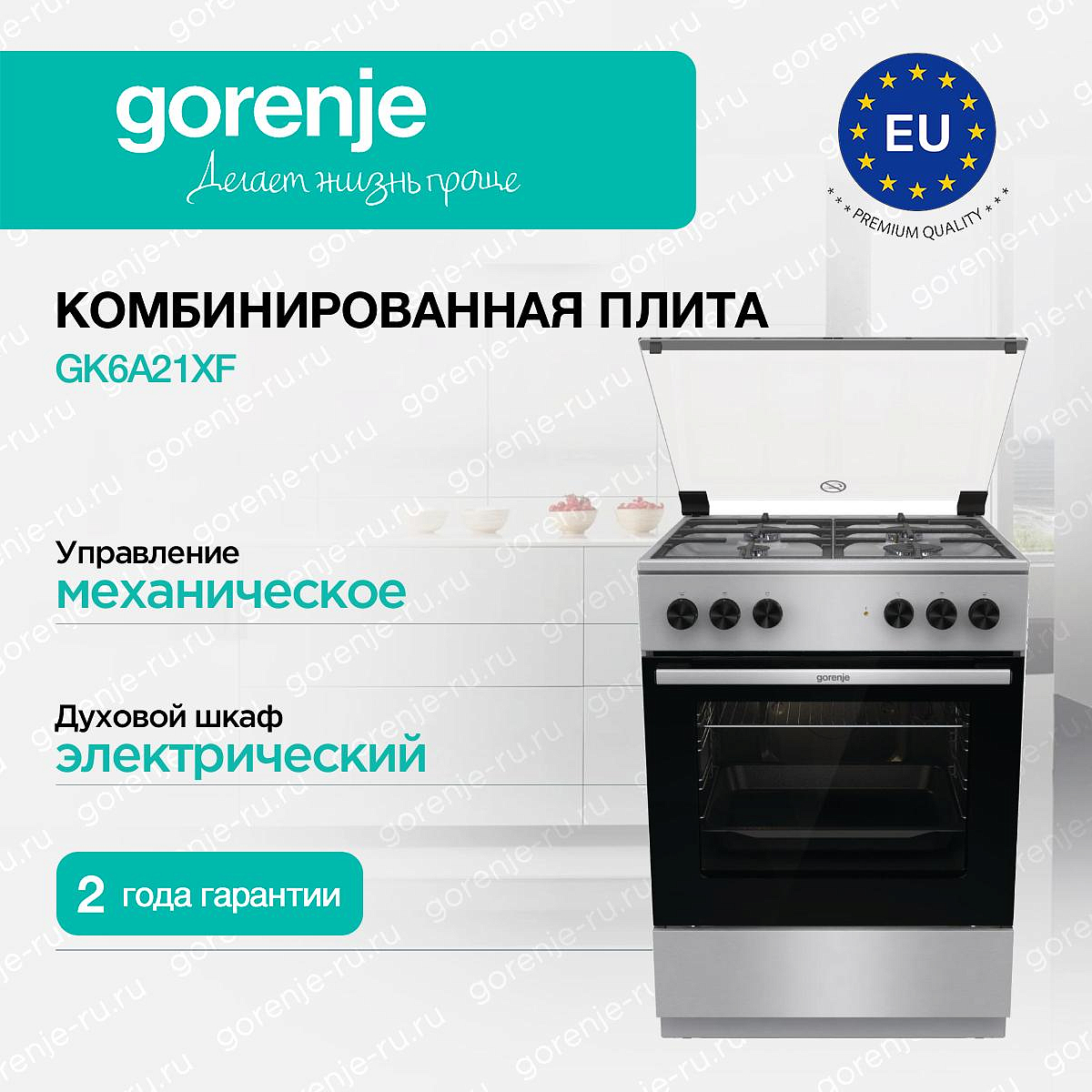 ** Все информационные материалы, представленные на Сайте, носят справочный характер и не могут в полной мере передавать достоверную информацию о свойствах, комплектации и характеристиках товара, включая цвета, размеры и формы. Фирма-производитель оставляет за собой право на внесение изменений в конструкцию, дизайн и комплектацию товара без предварительного уведомления. Перед оформлением Заказа Покупатель должен обратиться к Продавцу для уточнения свойств и характеристик Товара. Подробная информация о товаре указывается в инструкции и на упаковке товара. Используемое название в России: Горенье GK6A21XF