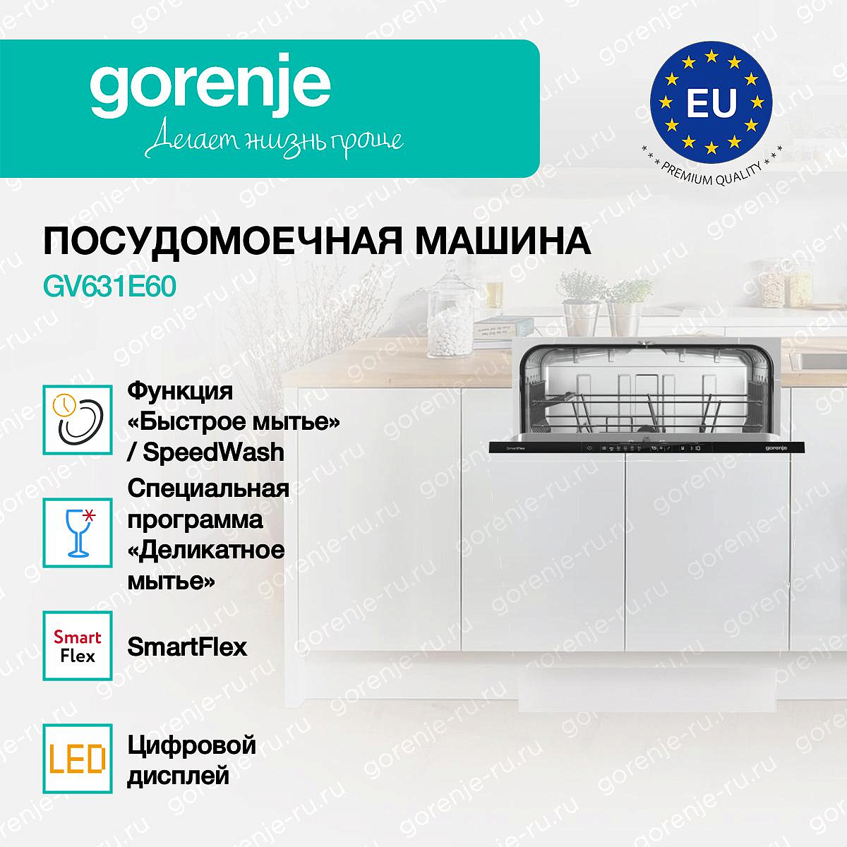 ** Все информационные материалы, представленные на Сайте, носят справочный характер и не могут в полной мере передавать достоверную информацию о свойствах, комплектации и характеристиках товара, включая цвета, размеры и формы. Фирма-производитель оставляет за собой право на внесение изменений в конструкцию, дизайн и комплектацию товара без предварительного уведомления. Перед оформлением Заказа Покупатель должен обратиться к Продавцу для уточнения свойств и характеристик Товара. Подробная информация о товаре указывается в инструкции и на упаковке товара. Используемое название в России: Горенье GV631E60