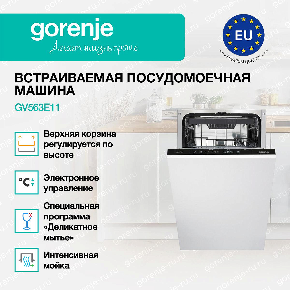 Встраиваемая посудомоечная машина Gorenje GV563E11 — это современное решение для компактных кухонь, где важны не только функциональность, но и рациональное использование пространства. Модель сочетает передовые технологии мойки, высокую энергоэффективность класса А+++ и продуманную конструкцию, позволяющую полностью интегрировать устройство даже в небольшой кухонный гарнитур. С вместимостью до 10 комплектов посуды машина идеально подходит для небольших семей или квартир-студий, обеспечивая качественную очистку даже самых сложных загрязнений.