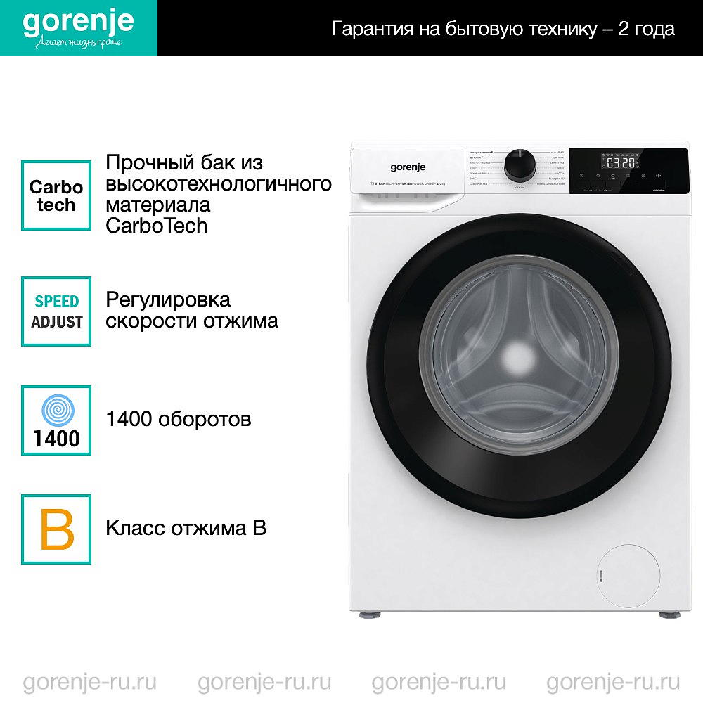 Стиральная машина Gorenje W1NHEI74SAS оснащена инвенторным мотором, который работает практически бесшумно и потребляет намного меньше электроэнергии, позволяя экономить на счетах. Он обеспечивает точное управление скоростью и вращением, что дает более эффективно работать с различными типами ткани и режимами стирки. Класс отжима B — по окончании цикла в одежде остается не более 45-50% влаги. Бак CarboTech вмещает до 7 килограмм одежды, не подвержен коррозии и абсолютно гигиеничен. Ножки регулируемые. Выбранные настройки и время всегда отображаются на удобном цифровом дисплее, благодаря которому легче задать необходимые параметры. Управление осуществляется с помощью поворотного регулятора.