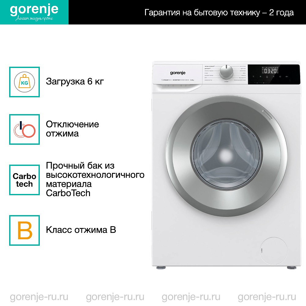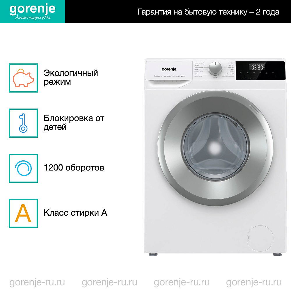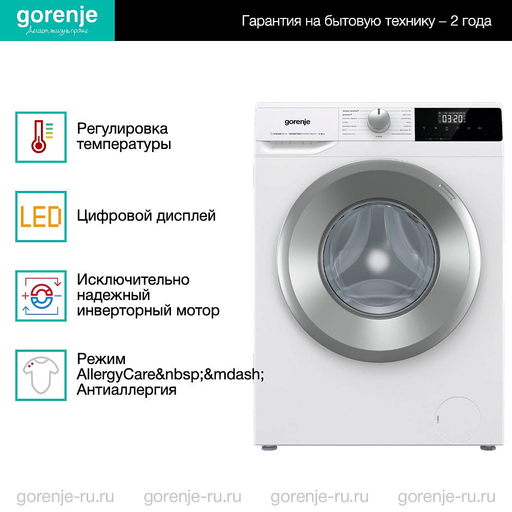 Стиральная машина Gorenje W2NHPI62SCS полностью белого цвета — и корпус, и загрузочный люк. Это компактная модель, ее глубина составляет всего 43,5 см. При этом ширина прибора — 59,7 см а высота — 85 см. Так как устройство устанавливается отдельно, его можно поставить в любом месте, где есть доступ к водопроводу и канализации, даже в коридоре. Инверторный мотор за счет конструкции, в которой нет щеток и ремней, очень долговечный. К тому же он работает тише других моделей, ведь в нем нет частей, которые трутся друг о друга.
