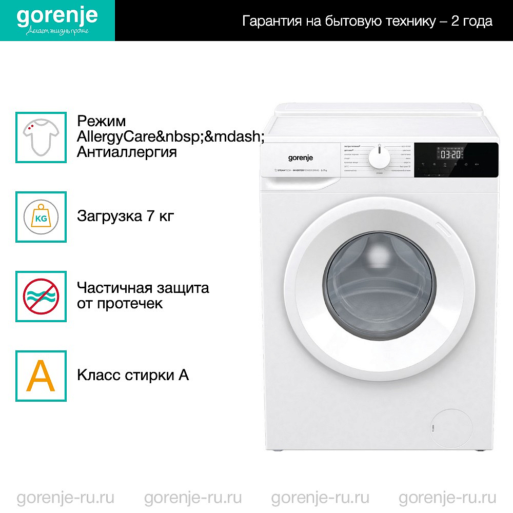 Вас приветствует официальный дилер бытовой техники Gorenje! Сегодня мы хотим представить вам одну из наших новинок - стиральную машину Gorenje W2NHPI72SCSIRV. Это устройство сочетает в себе элегантный дизайн и последние технологические разработки, обеспечивая безупречное качество стирки. Машинка Gorenje W2NHPI72SCSIRV выполнена в классическом белом цвете, что делает ее идеальным дополнением к любому интерьеру. Белый загрузочный люк гармонично вписывается в общий дизайн и подчеркивает стильность устройства. Тип загрузки в данной устройства - фронтальный, что дает удобно размещать машину в любом помещении, будь то ванная комната или кухня. Фронтальная загрузка также значительно облегчает процесс загрузки и выгрузки белья, делая его более комфортным и быстрым. Максимальная загрузка для стирки хлопка в этом устройстве составляет 7 кг. Это оптимальный показатель, который подходит как для небольших, так и для больших семей.