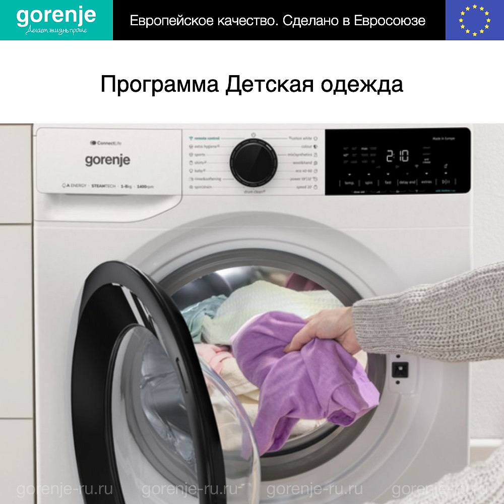 Стиральная машина Горенье WNA94ACIS подходит для любых видов тканей. Имеются режимы для хлопка, синтетики и шерсти. Есть программы для быстрой и интенсивной стирки, для детской одежды и спортивных вещей. При необходимости можно запустить дополнительное полоскание или отжим. Эко режим позволяет экономить электроэнергию и воду. Однако, нужно учитывать, что такая программа занимает больше времени, чем стандартные. Опция обработки паром предназначена в первую очередь для чистой одежды, которая долго хранилась в шкафу. Вы всегда можете добавить вещи в процессе стирки. Не страшно, если вы забыли что-то положить в барабан. Просто нажмите на паузу и откройте дверцу.