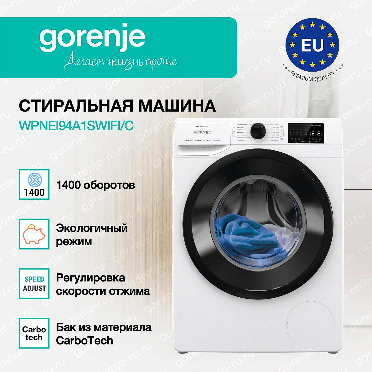 ** Все информационные материалы, представленные на Сайте, носят справочный характер и не могут в полной мере передавать достоверную информацию о свойствах, комплектации и характеристиках товара, включая цвета, размеры и формы. Фирма-производитель оставляет за собой право на внесение изменений в конструкцию, дизайн и комплектацию товара без предварительного уведомления. Перед оформлением Заказа Покупатель должен обратиться к Продавцу для уточнения свойств и характеристик Товара. Подробная информация о товаре указывается в инструкции и на упаковке товара. Используемое название в России: Горенье WPNEI94A1SWIFI/C