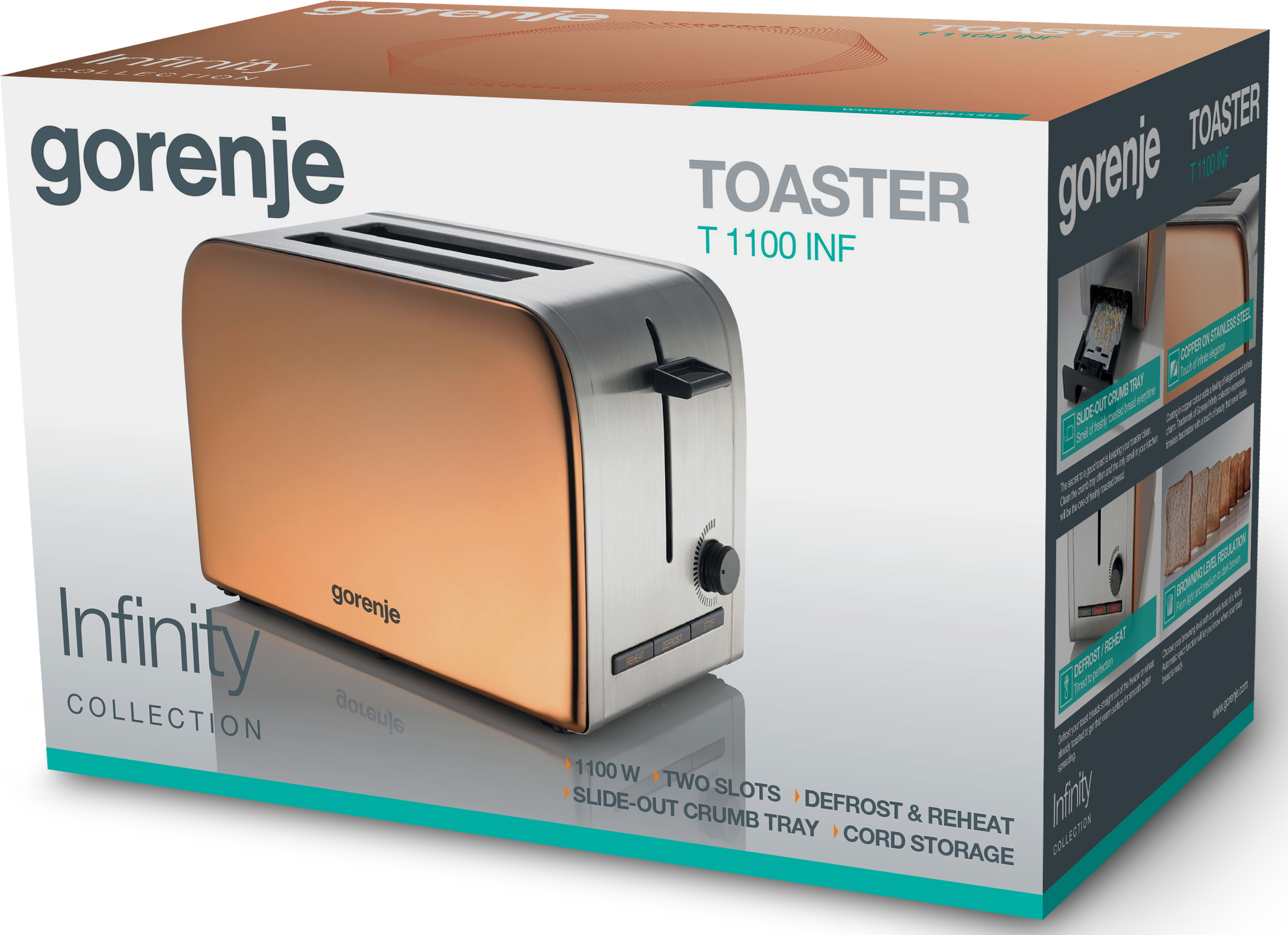 Стильный металлический тостер Gorenje T 1100 INF из коллекции INFINITY сочетает в себе два цвета — «медь» и «серебристый». Функция размораживания обеспечивает равномерное и аккуратное оттаивание хлеба, который хранился в морозильнике. Световая индикация отображает режим работы. Термостат поможет выбрать одну из шести степеней обжарки.