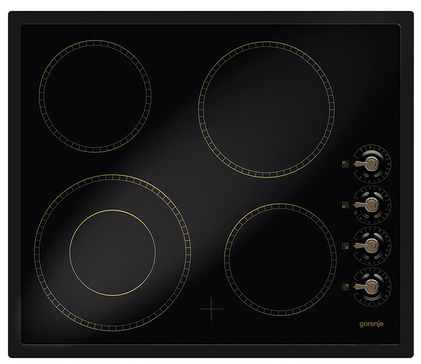 Независимая электрическая варочная панель Gorenje ECK 63 CLB — модель из линейки Classico с поворотными переключателями цвета бронзы. Индикаторы остаточного тепла исключают возможность ожогов и позволяют использовать уже выключенные конфорки для подогрева блюд.