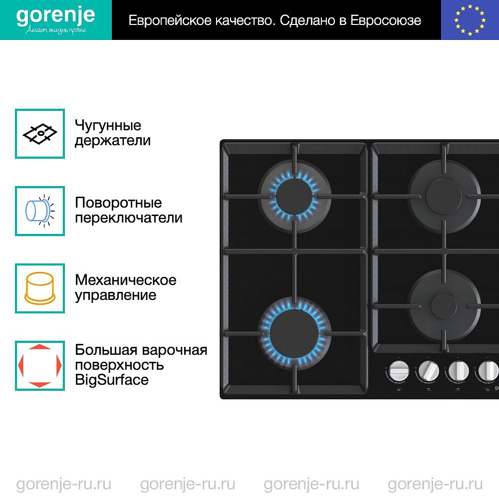 Варочная панель Горение оснащена функцией газ-контроль, которая обеспечивает безопасность использования, автоматически перекрывая подачу газа в случае случайного погашения пламени на конфорках.