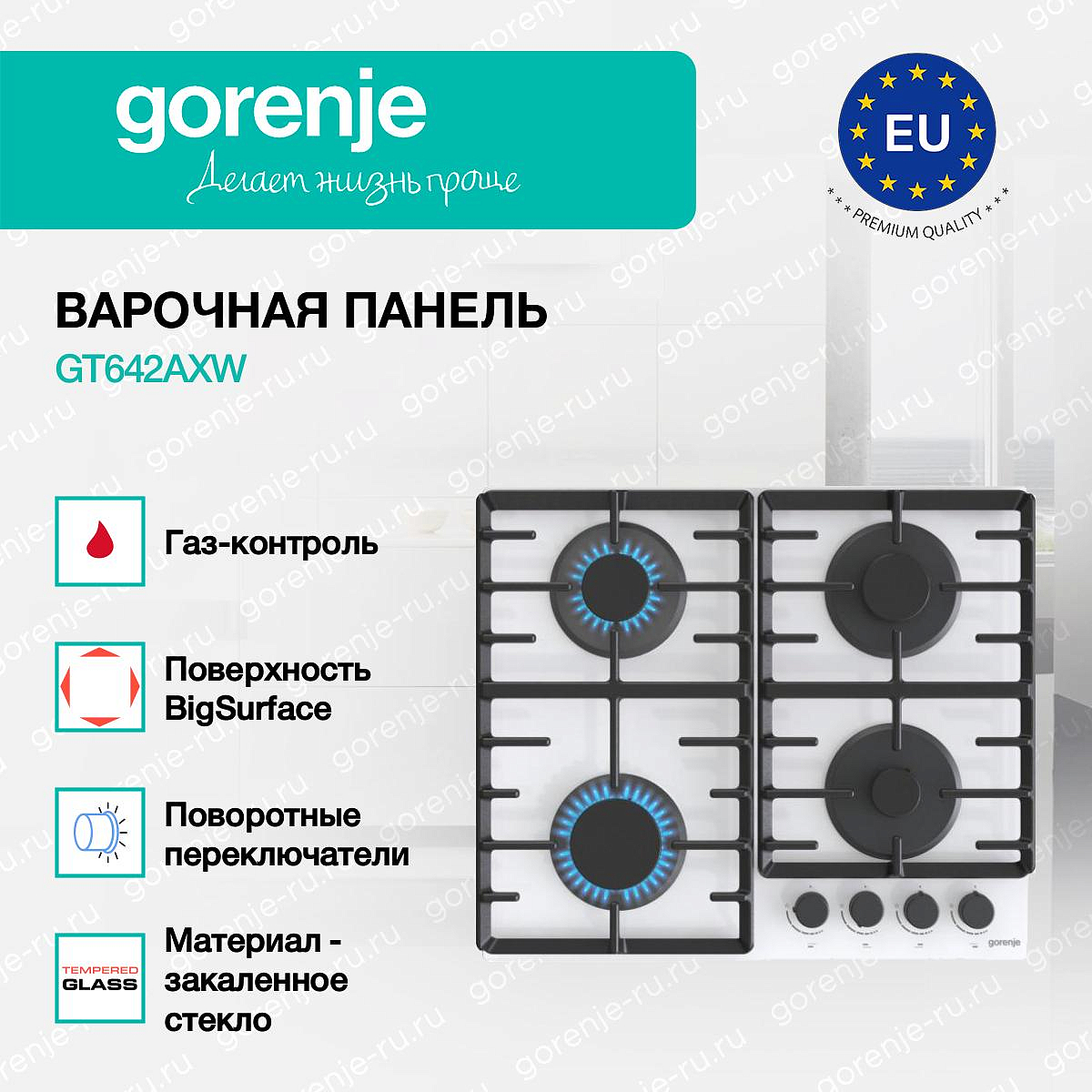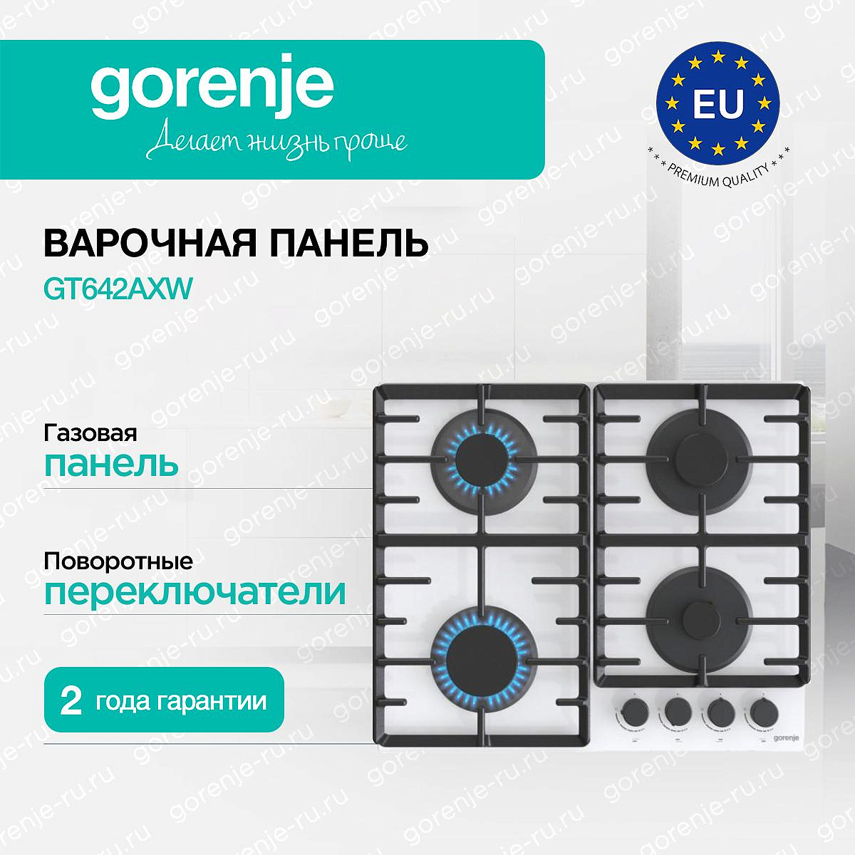 ** Все информационные материалы, представленные на Сайте, носят справочный характер и не могут в полной мере передавать достоверную информацию о свойствах, комплектации и характеристиках товара, включая цвета, размеры и формы. Фирма-производитель оставляет за собой право на внесение изменений в конструкцию, дизайн и комплектацию товара без предварительного уведомления. Перед оформлением Заказа Покупатель должен обратиться к Продавцу для уточнения свойств и характеристик Товара. Подробная информация о товаре указывается в инструкции и на упаковке товара. Используемое название в России: Горенье GT642AXW