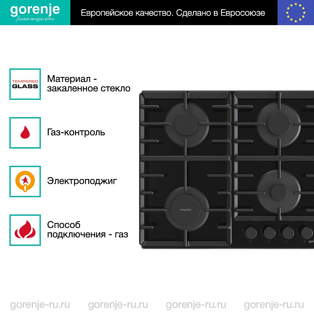 Независимая газовая варочная панель Gorenje GT642SYB — модель коллекции Simplicity, которая сочетает в себе привычный и элегантный дизайн и инновационные технологии, служащие для вашего удобства. Так, решетки ProGrid выполнены из чугуна, который не деформируется под воздействием бытового пламени и способен выдерживать высокие температуры. Благодаря этому поверхность остается ровной, обеспечивая лучшую устойчивость утвари, и по ней можно передвигать посуду, не поднимая ее. Панель сделана из закаленного стекла черного цвета. Оно отличается повышенной устойчивостью к механическим воздействиям, и раскалывается на крупные куски с закругленными краями, вместо маленьких, что делает эксплуатацию безопаснее. Также такое стекло не нуждается в специальном уходе.