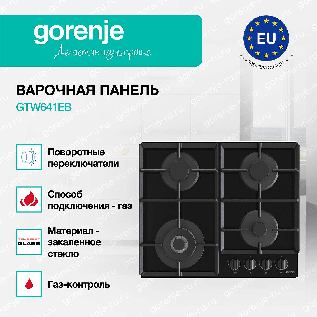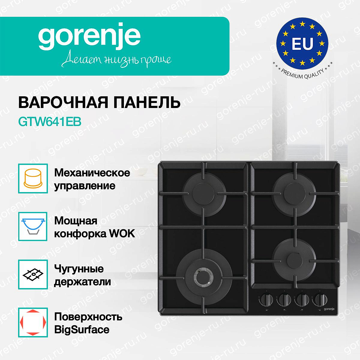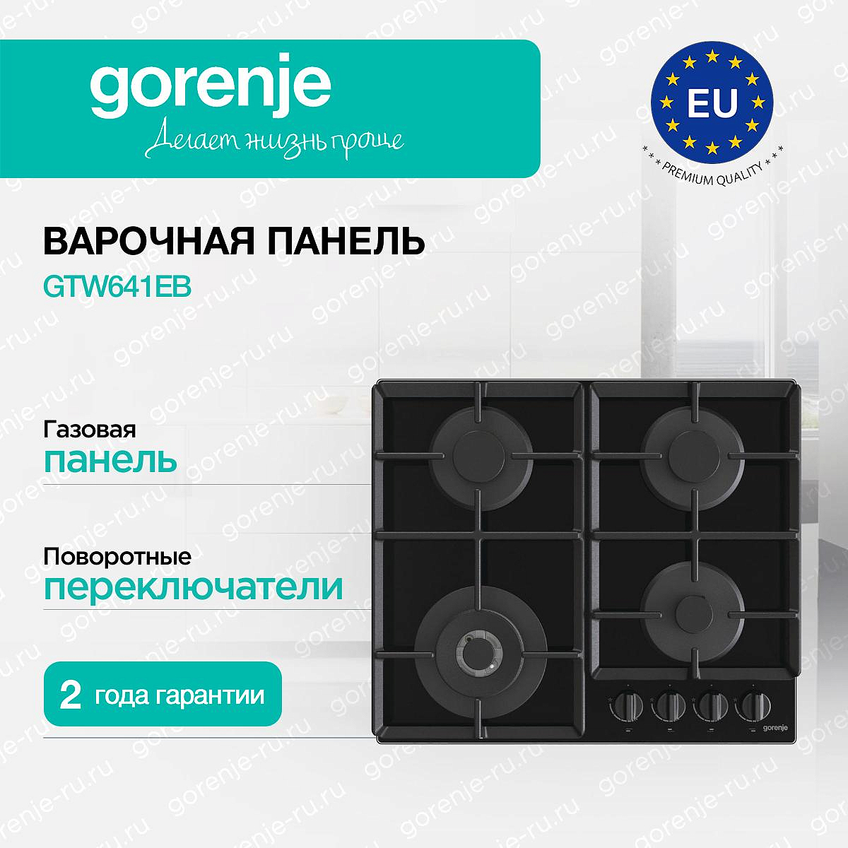 ** Все информационные материалы, представленные на Сайте, носят справочный характер и не могут в полной мере передавать достоверную информацию о свойствах, комплектации и характеристиках товара, включая цвета, размеры и формы. Фирма-производитель оставляет за собой право на внесение изменений в конструкцию, дизайн и комплектацию товара без предварительного уведомления. Перед оформлением Заказа Покупатель должен обратиться к Продавцу для уточнения свойств и характеристик Товара. Подробная информация о товаре указывается в инструкции и на упаковке товара. Используемое название в России: Горенье GTW641EB
