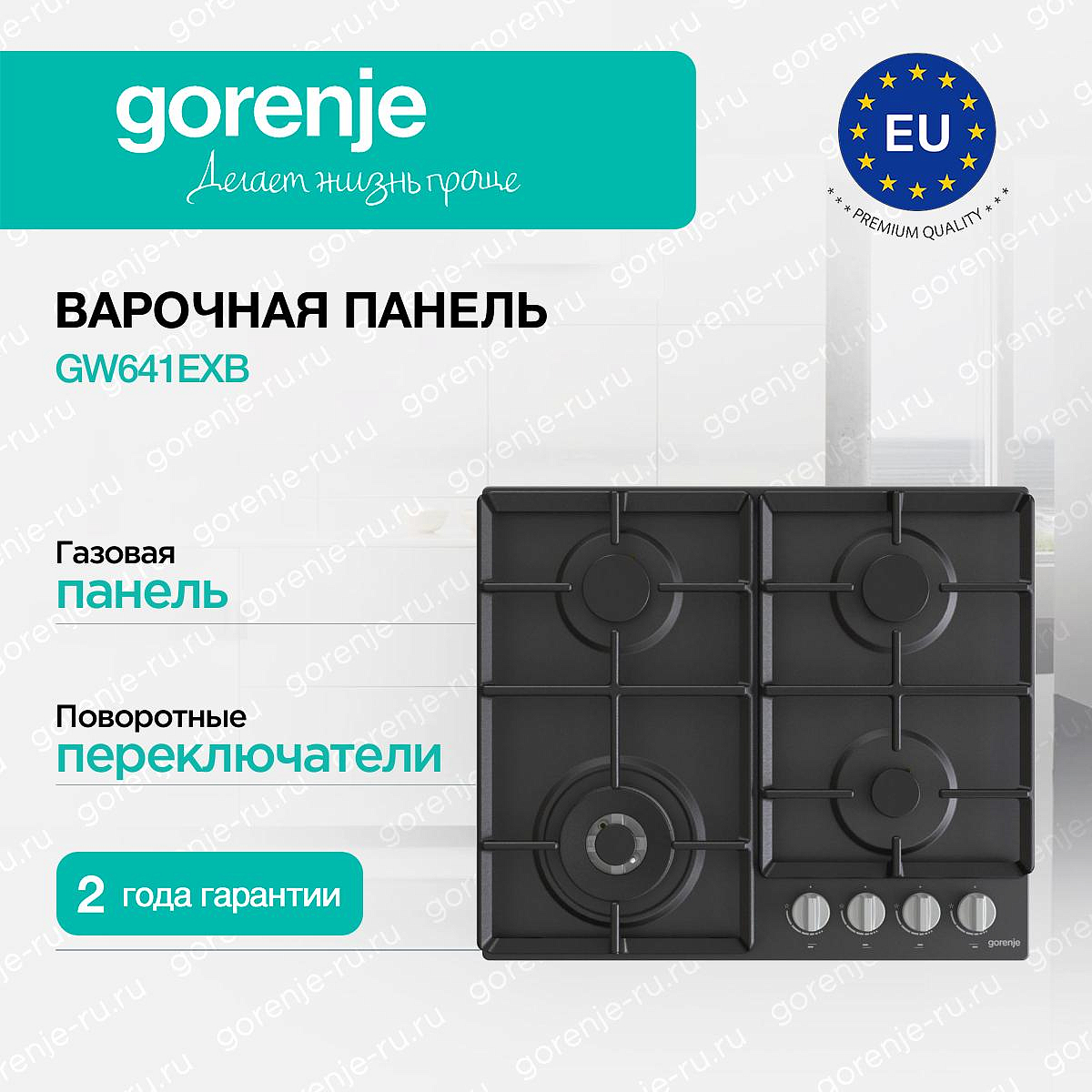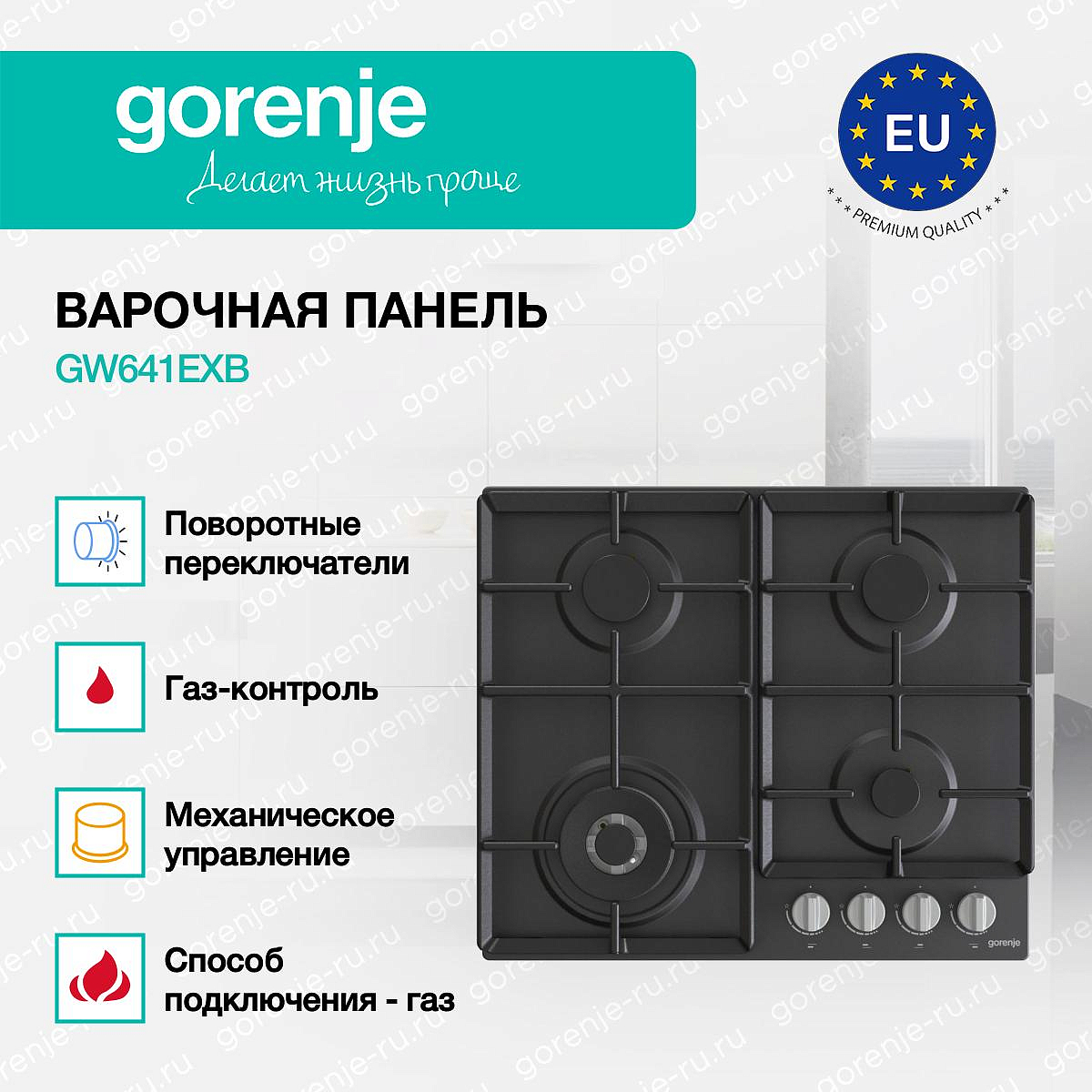 ** Все информационные материалы, представленные на Сайте, носят справочный характер и не могут в полной мере передавать достоверную информацию о свойствах, комплектации и характеристиках товара, включая цвета, размеры и формы. Фирма-производитель оставляет за собой право на внесение изменений в конструкцию, дизайн и комплектацию товара без предварительного уведомления. Перед оформлением Заказа Покупатель должен обратиться к Продавцу для уточнения свойств и характеристик Товара. Подробная информация о товаре указывается в инструкции и на упаковке товара. Используемое название в России: Горенье GW641EXB