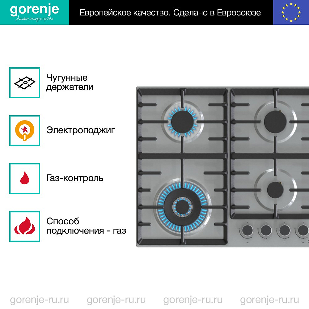 Особенностью является система газ-контроль, которая автоматически перекрывает подачу газа при погасании пламени, гарантирует безопасность во время использования. Еще одним преимуществом являются чугунные держатели для посуды, которые обеспечивающие устойчивость и равномерное распределение тепла.